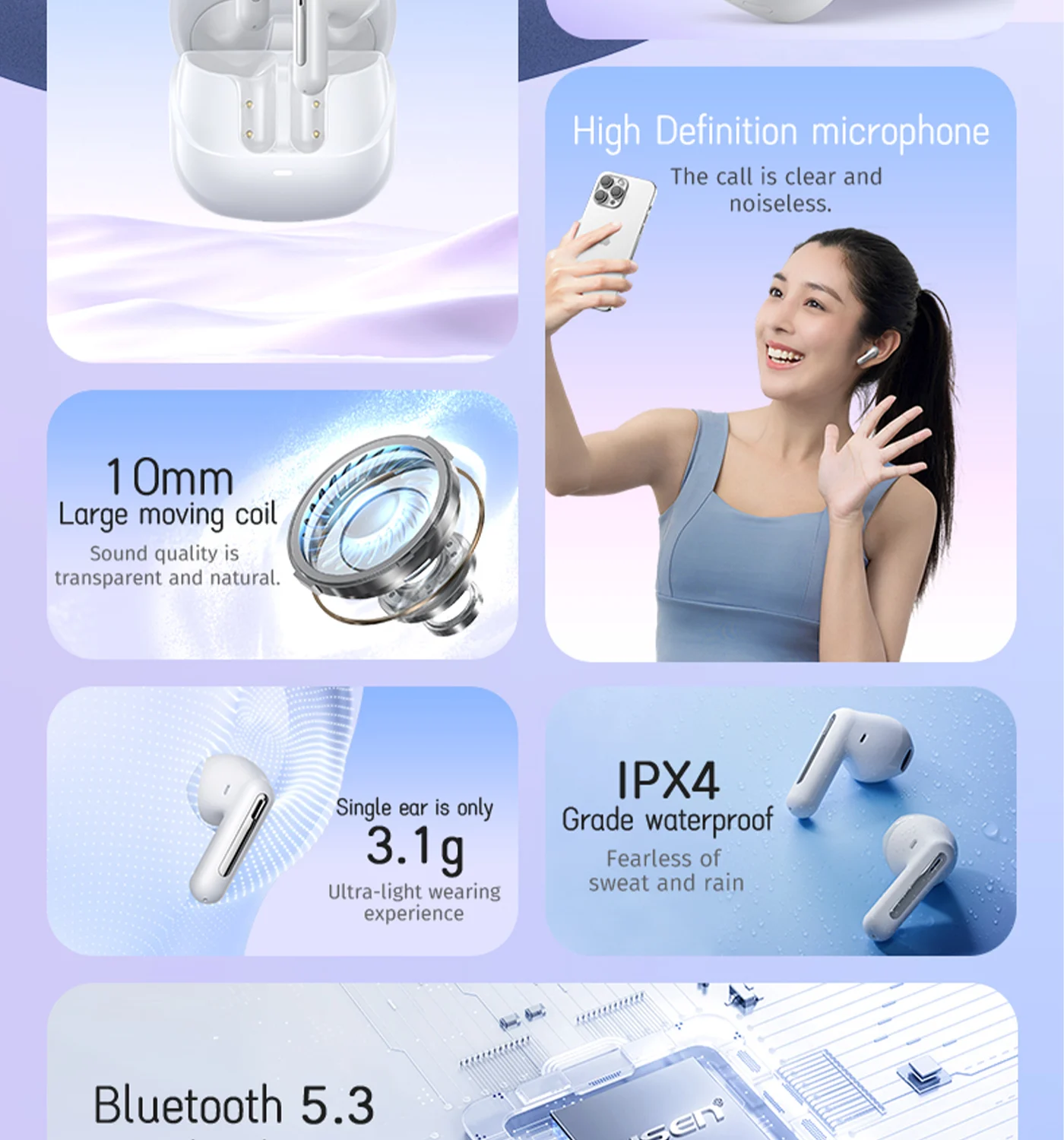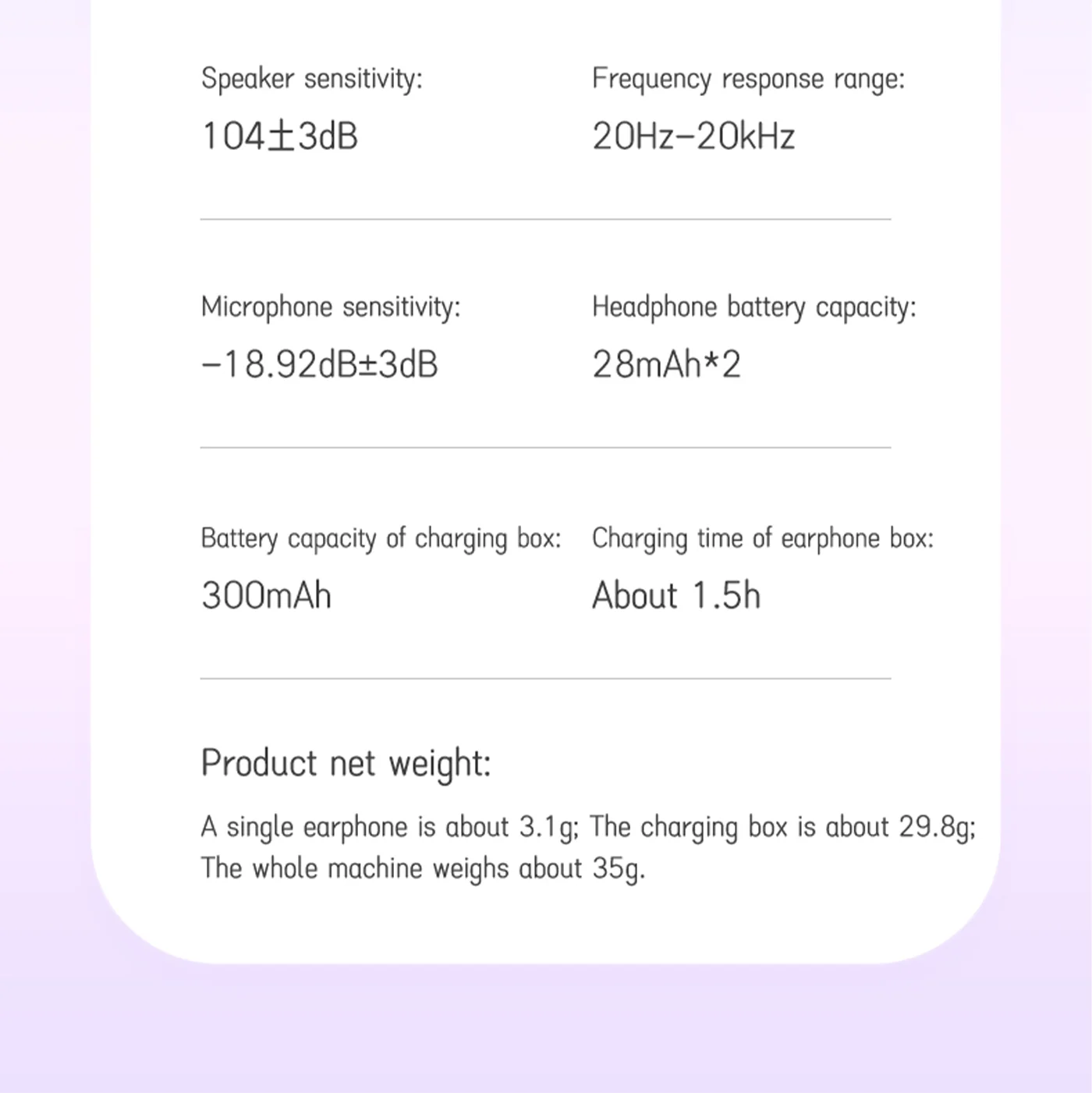 A single earphone is about 3.1g; The charging box is about 29.8g; The whole machine weighs about 35g.