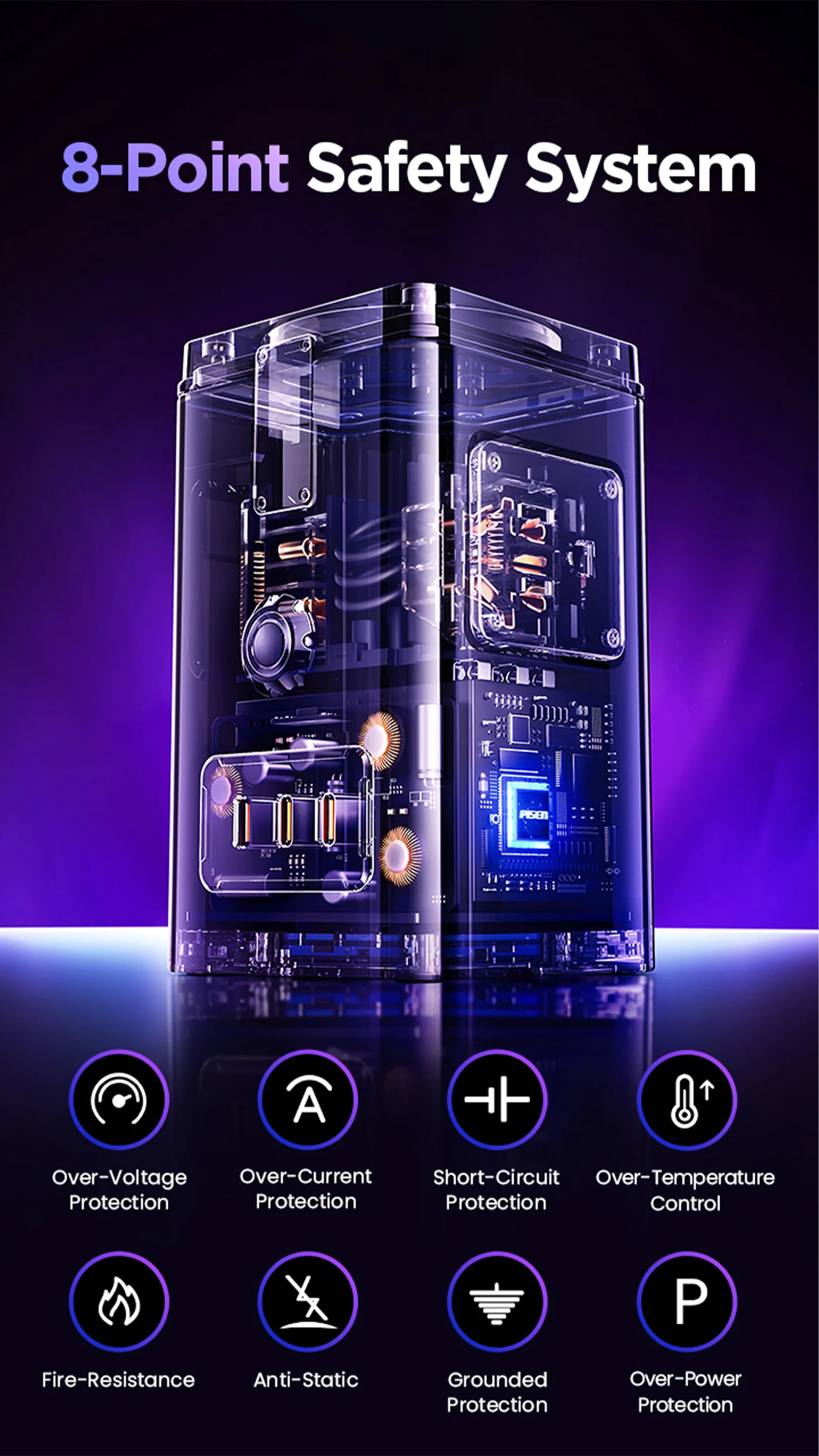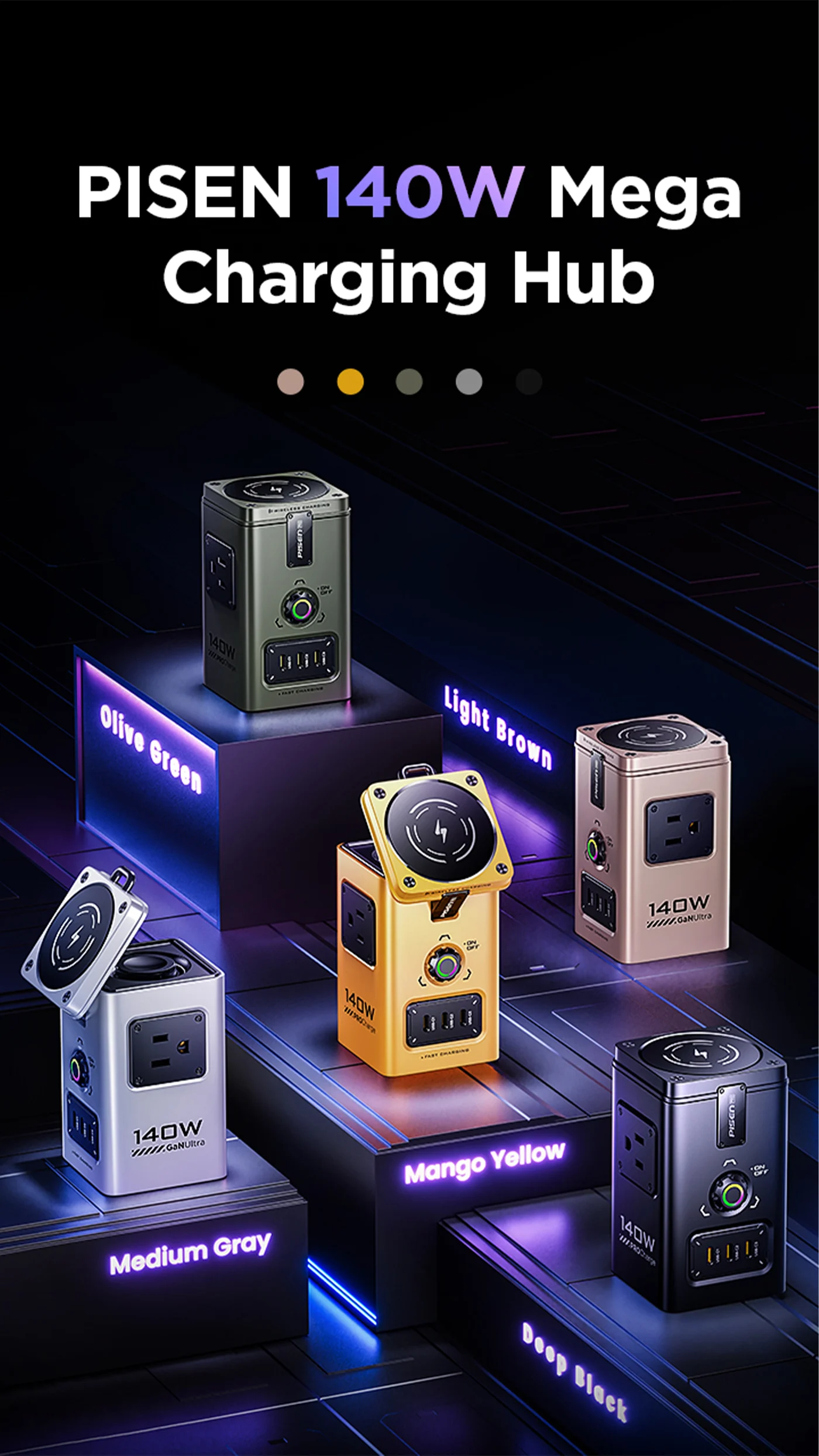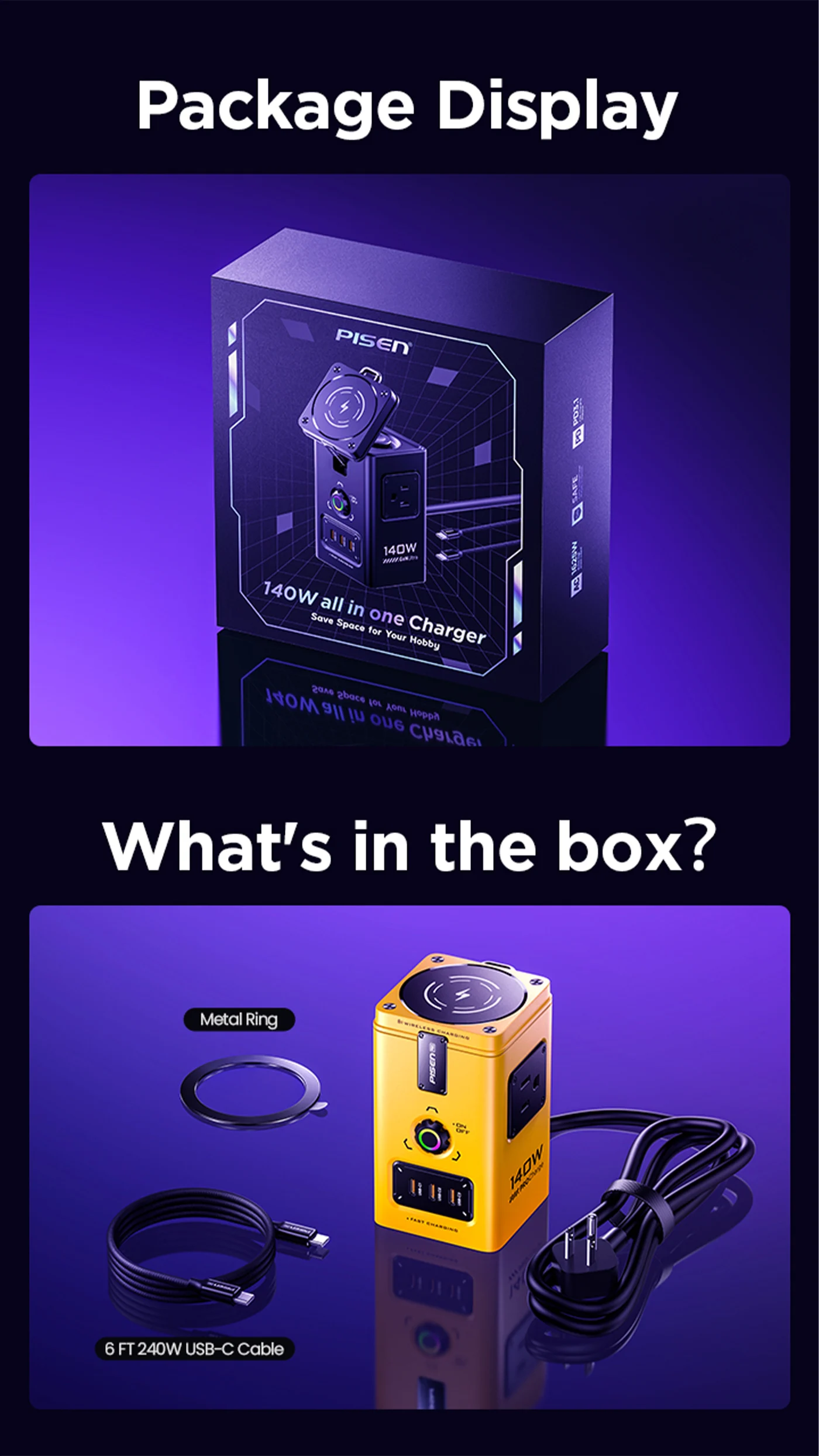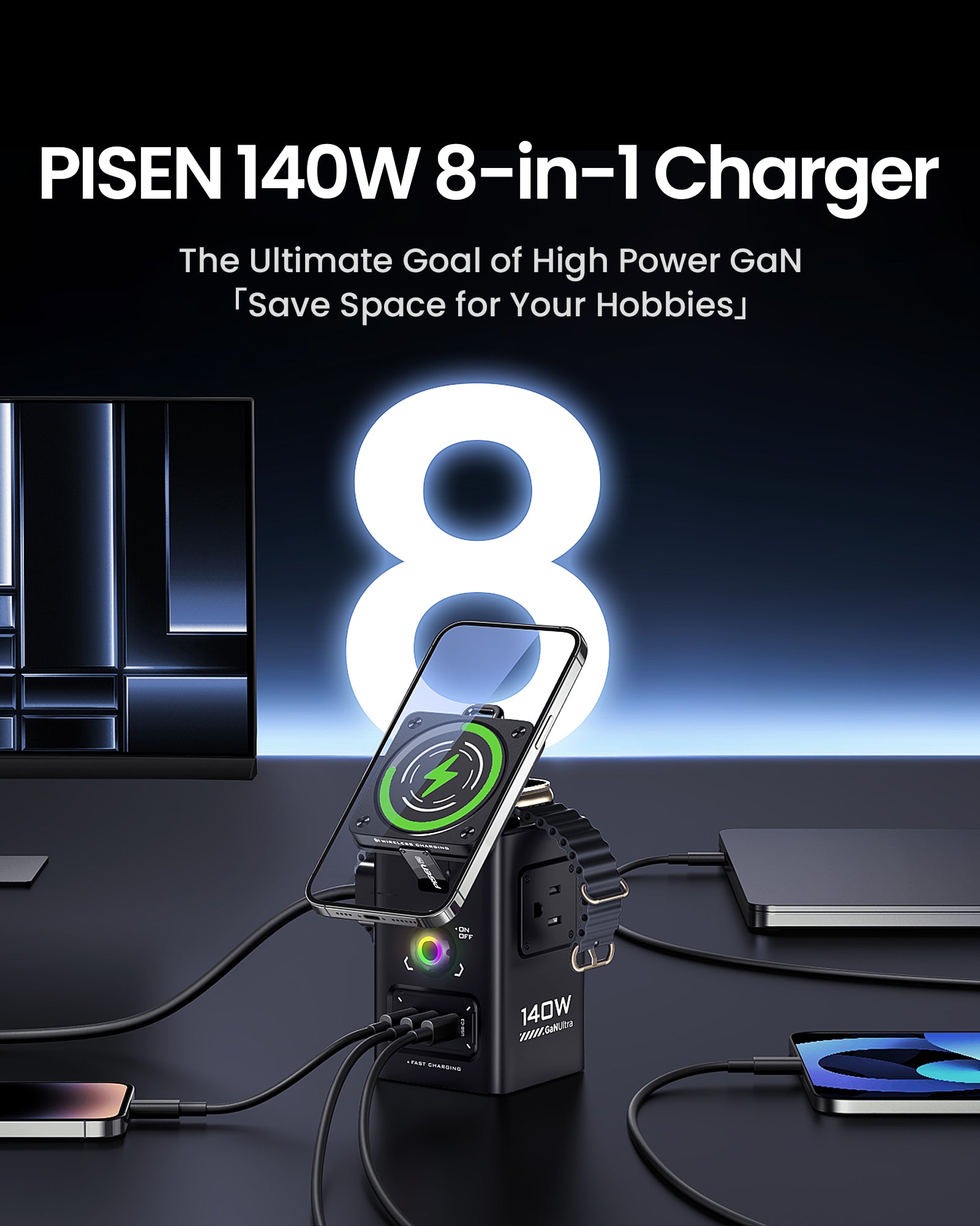 - Safety Protection System: Thanks to the revolutionary GaN Tech, PISEN wireless charging station efficiency is significantly increased, the size is more space-saving, the heat generation is improved. PISEN 140W GaN charging station is equipped with 9 safety protection systems can protects your device from short circuit and adjusts the power output to protect your devices’ battery.