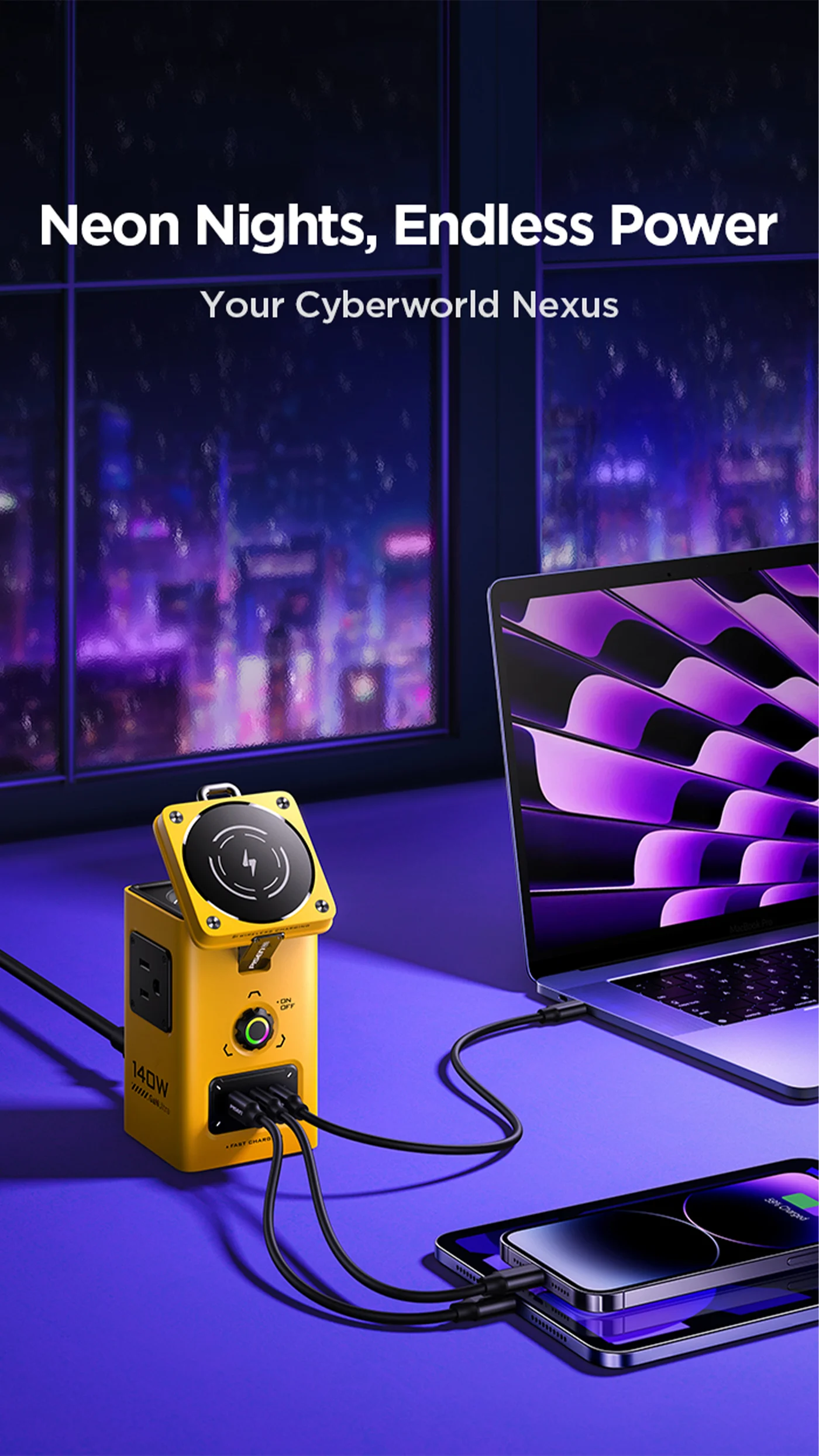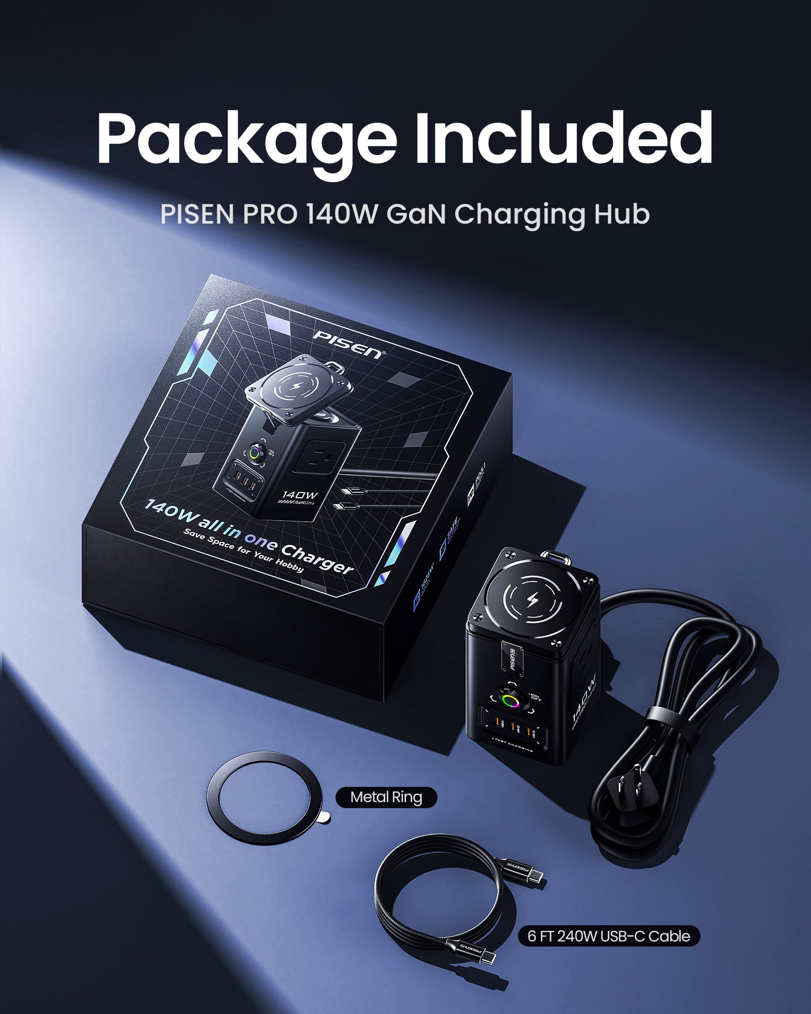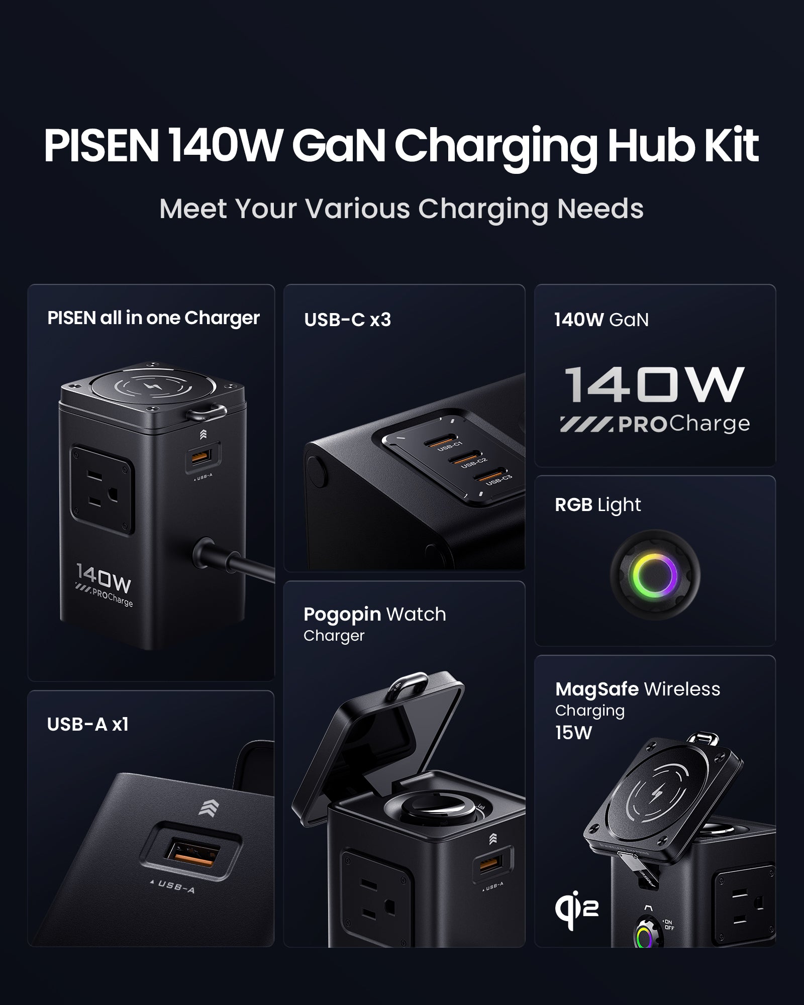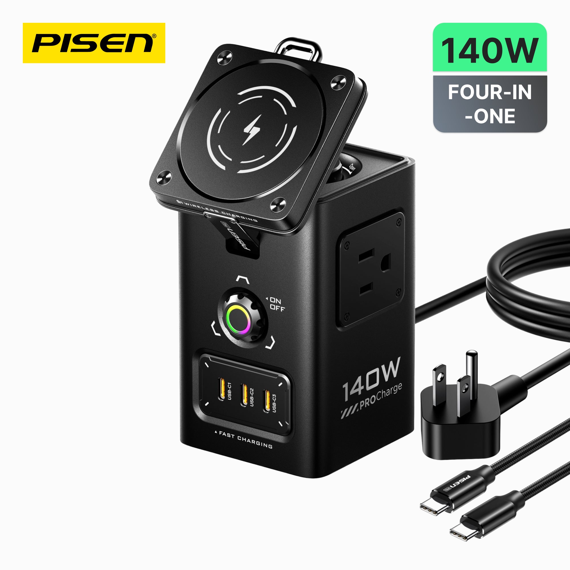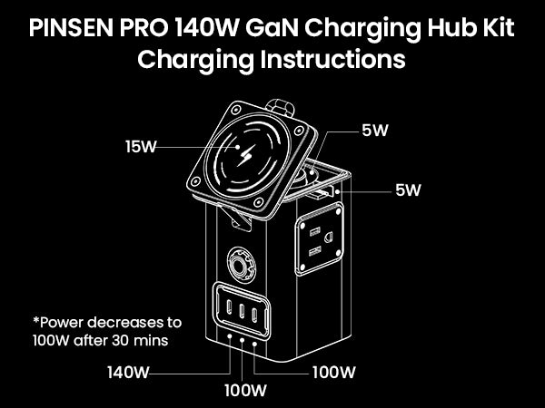 - 140W Fast Charging Station: PISEN 140W GaN USB charging station supports 140W max output at single port on USB-C1 can charge your devices efficiently. Charge for MacBook Pro: 0% to 56% in 30mins charging. Charge for New iPad Pro: 0% to 70% in 1h charging. Charge for iPhone 16 Pro Max: 0% to 80% in 1h charging.