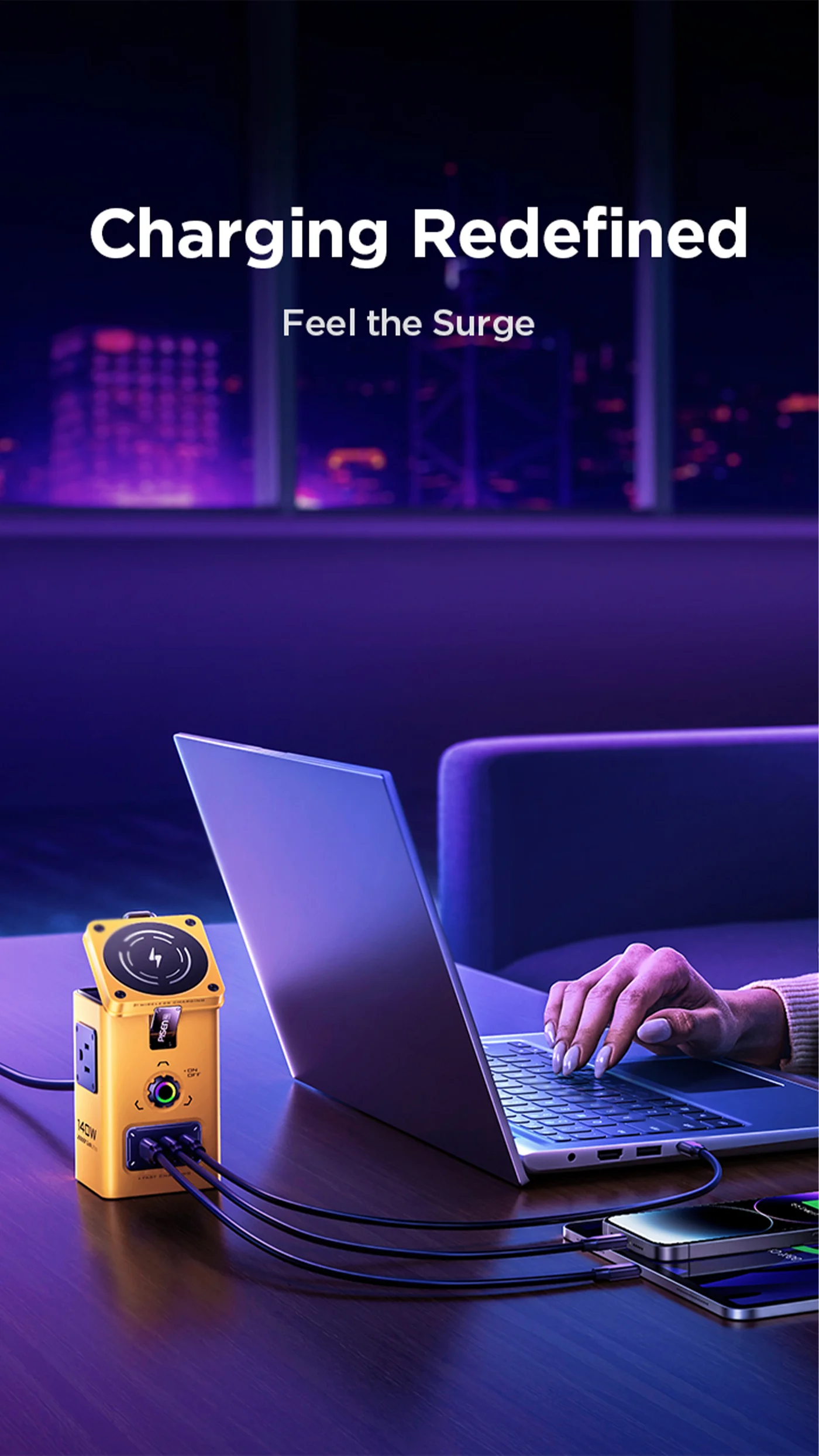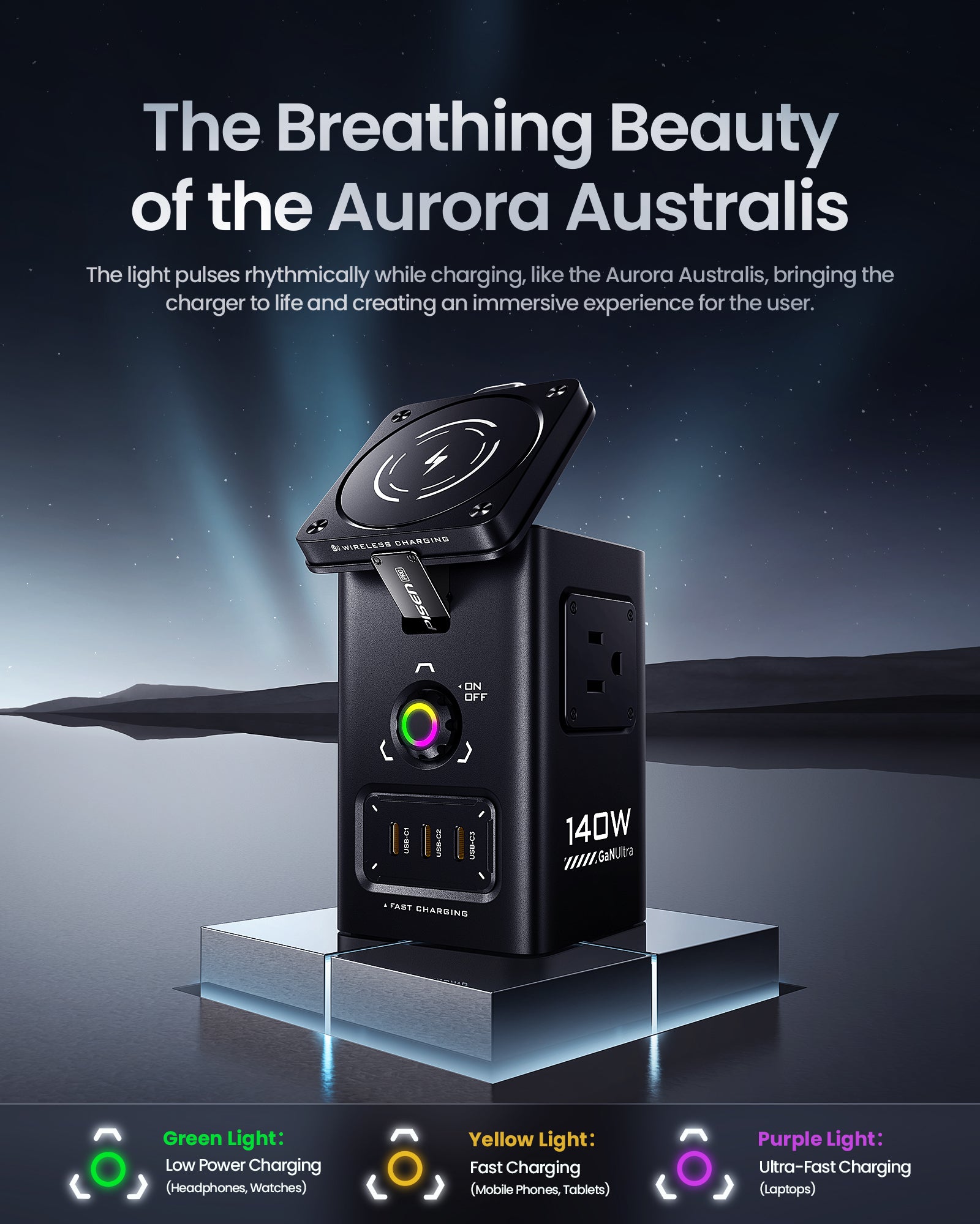 - Breathing Light of The Aurora Australis: The light appears to breathe when charging is in progress, like the Aurora Australis, bringing the whole charging station to life. PISEN 140W USB charging station with safety switch, adaptive voltage measurement, linked switch display three-color changing breathing light system. Lighting effects: green (5V) purple (9V-15V) yellow (20V).