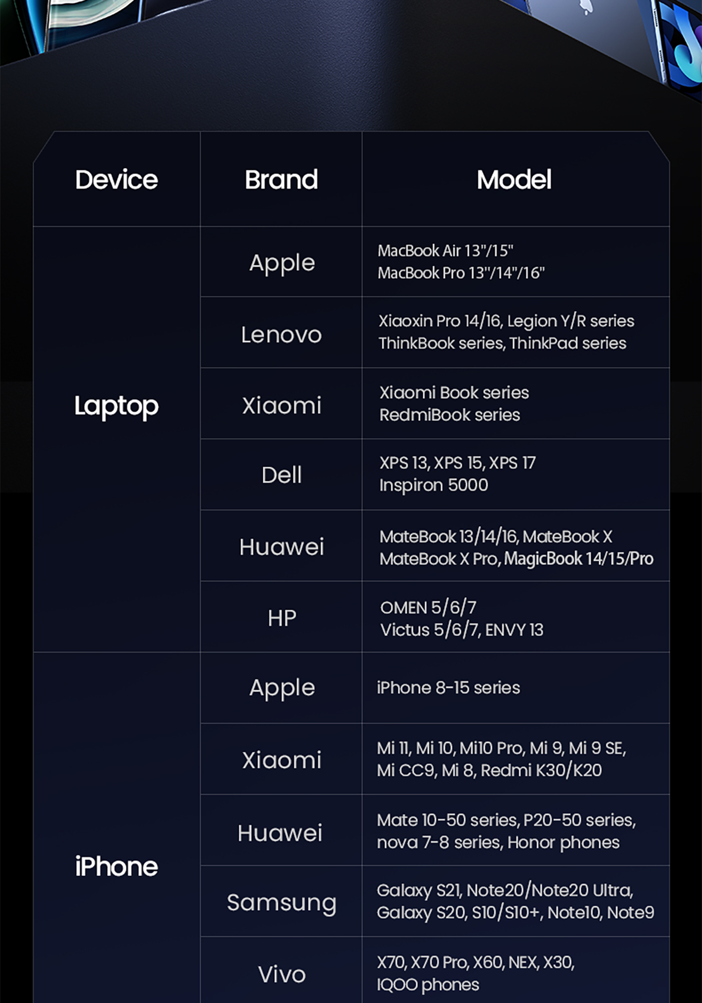 Supports PD3.0, QC3.0, PPS, AFC, SCP, FCP for universal fast charging.