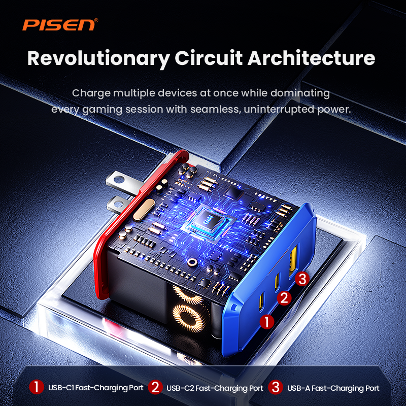 1×USB‑C + 2×USB‑A; charge laptop, phone, TWS at once for gaming/office.