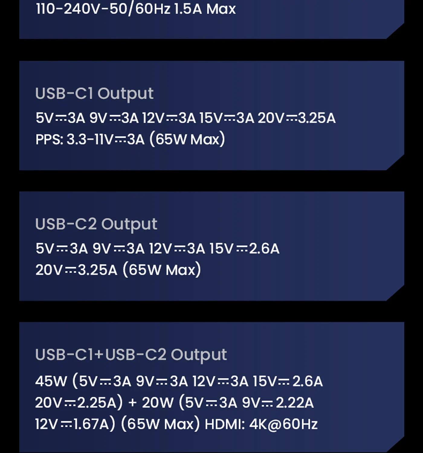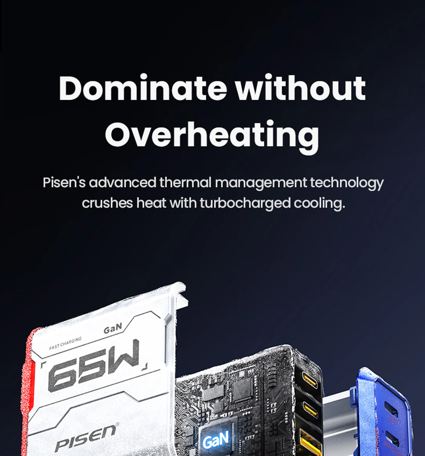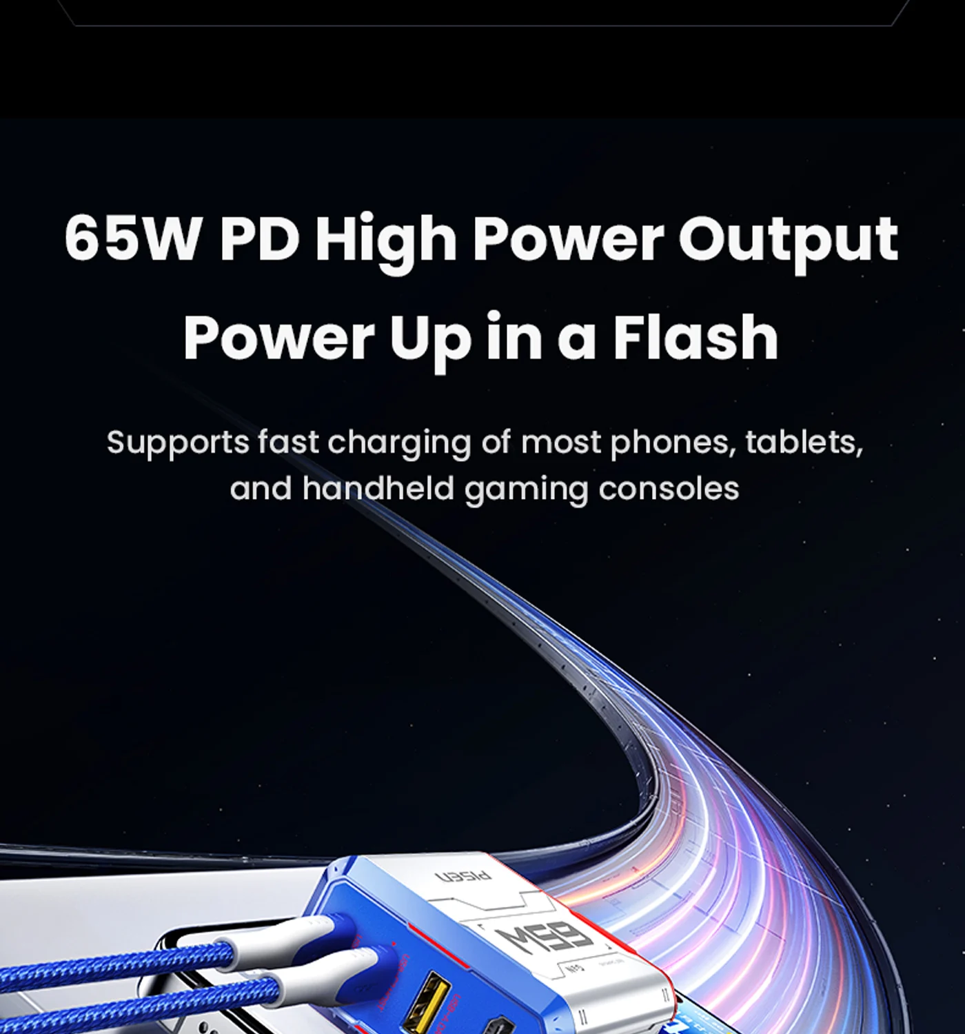 Low-heat fast charging, single USB-C port max 65W for laptops/consoles.