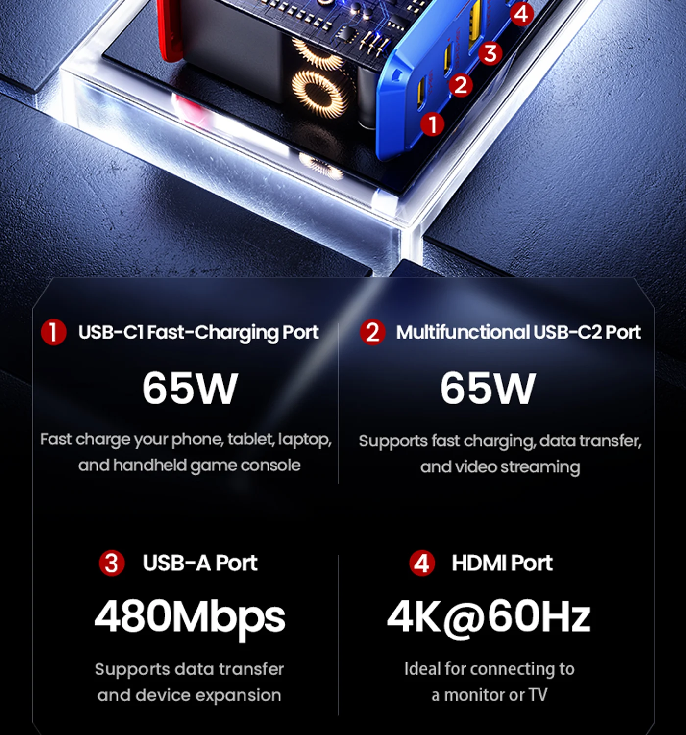 2×USB-C, 1×USB-A, 1×HDMI; charge devices and stream 4K@60Hz content.
