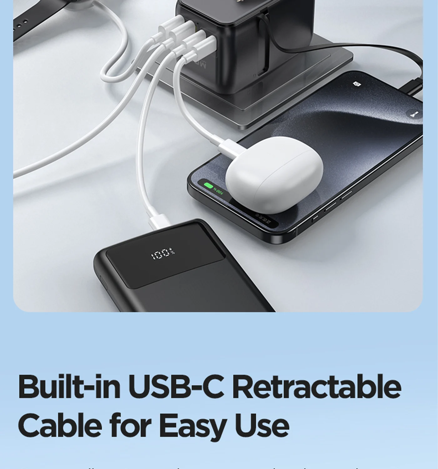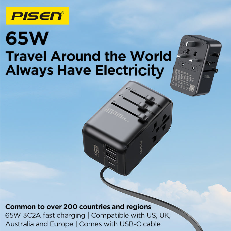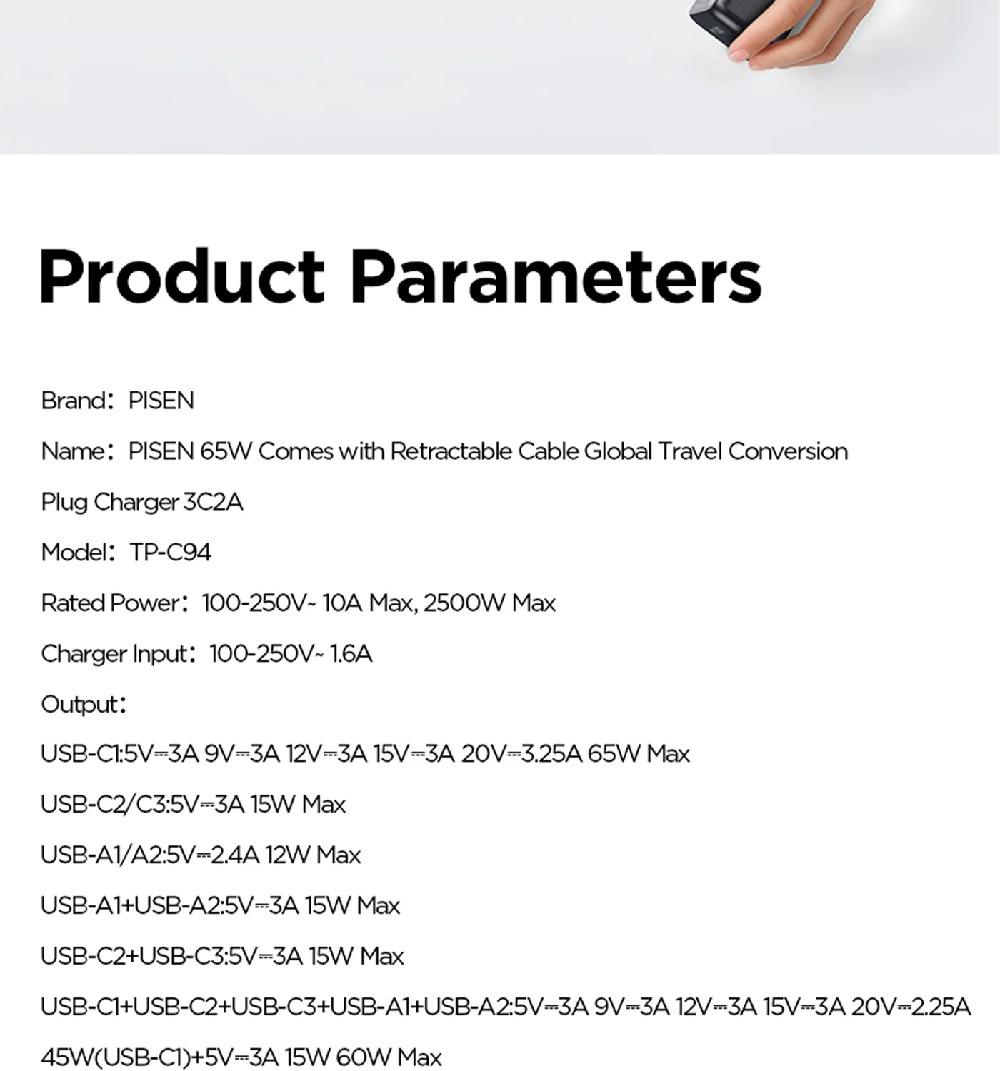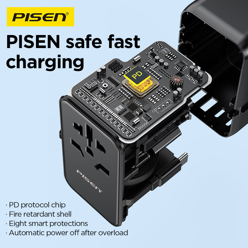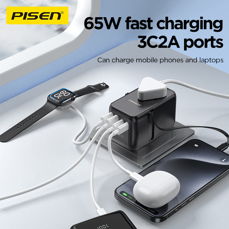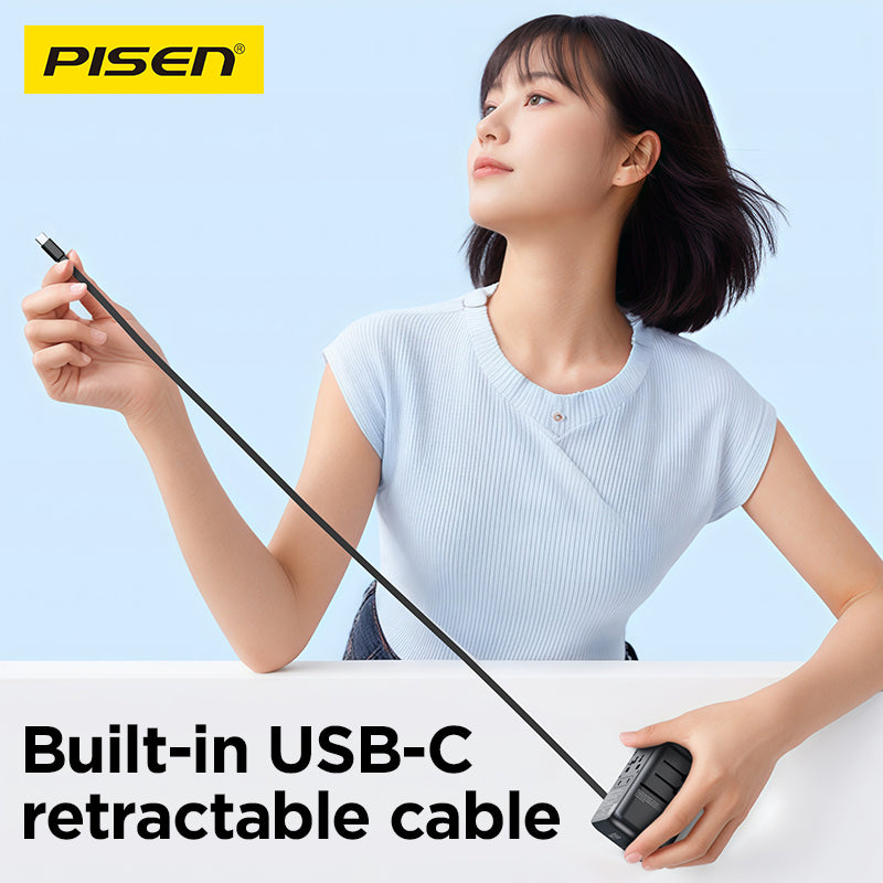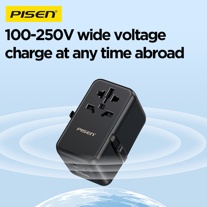 100‑240V universal input, foldable plugs (US/EU/UK/AUS), ideal for global travel. Works with MacBook, iPhone, iPad, Android, TWS, etc.