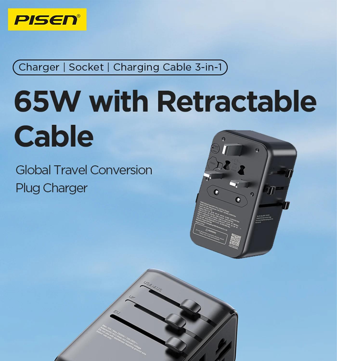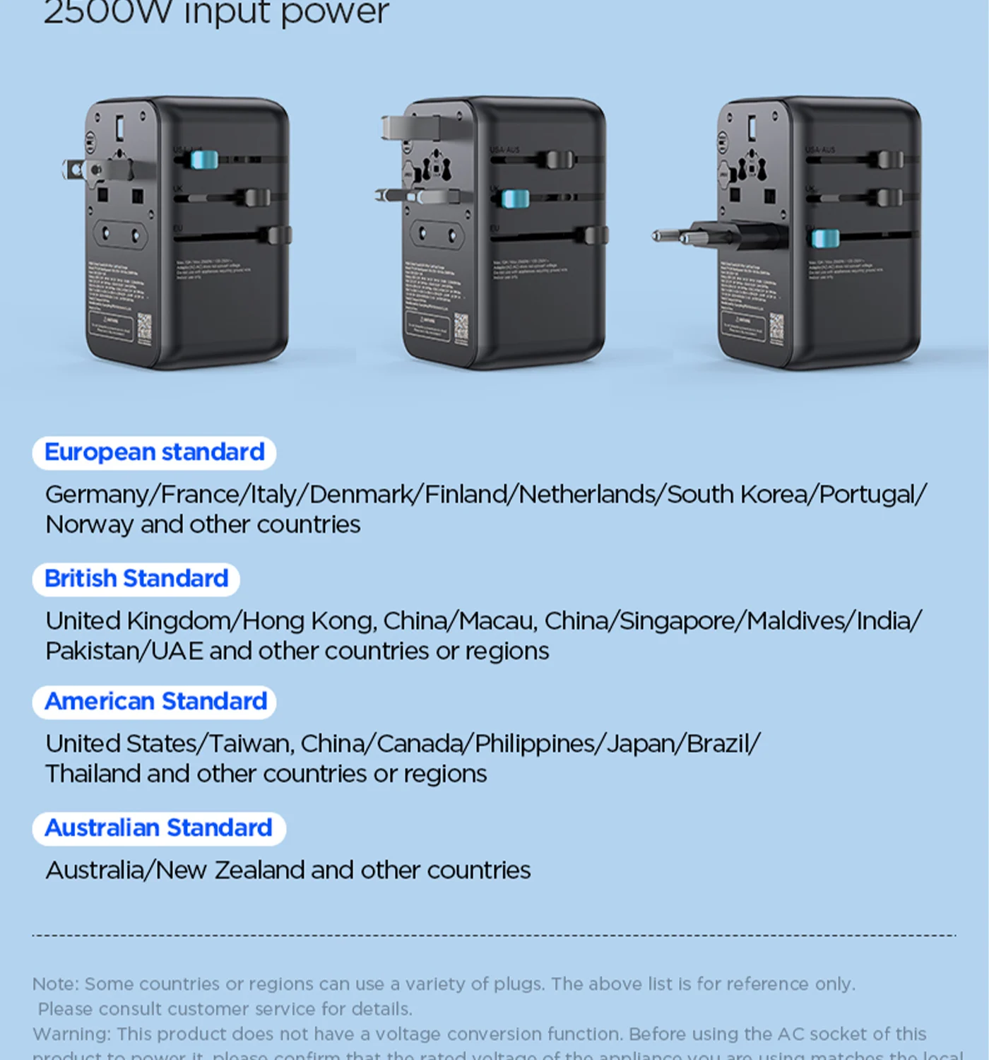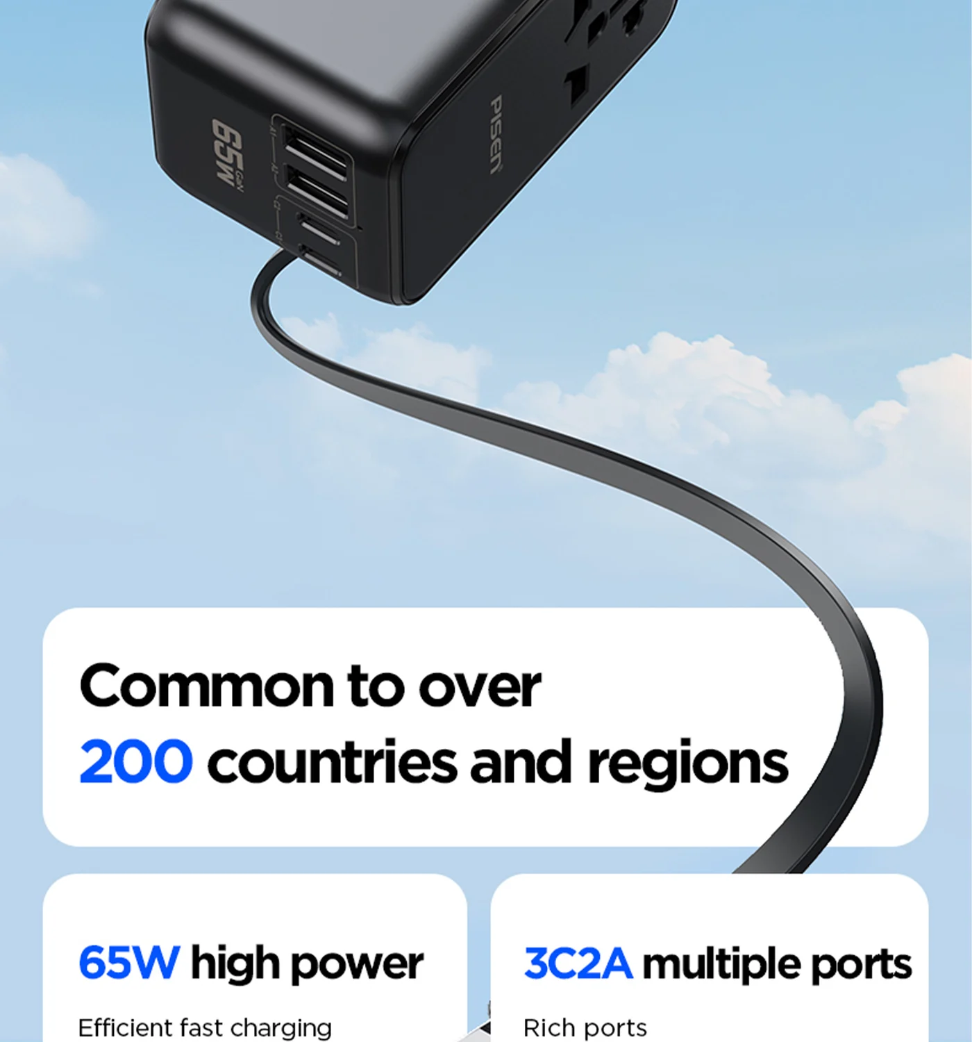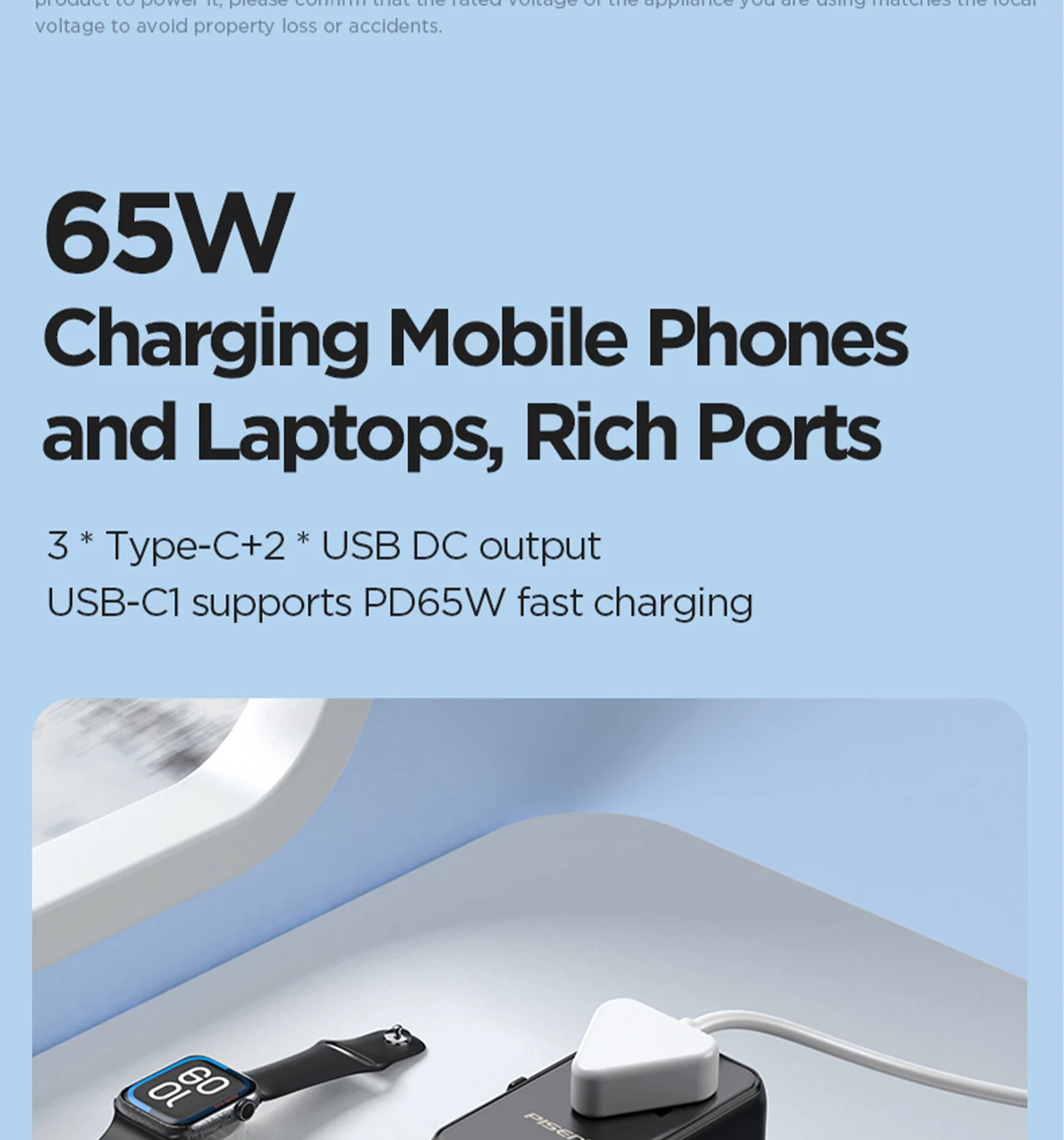 100‑240V universal input, foldable plugs (US/EU/UK/AUS), ideal for global travel. Works with MacBook, iPhone, iPad, Android, TWS, etc.