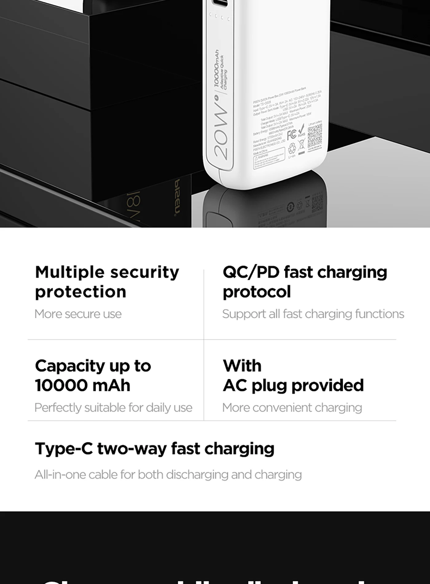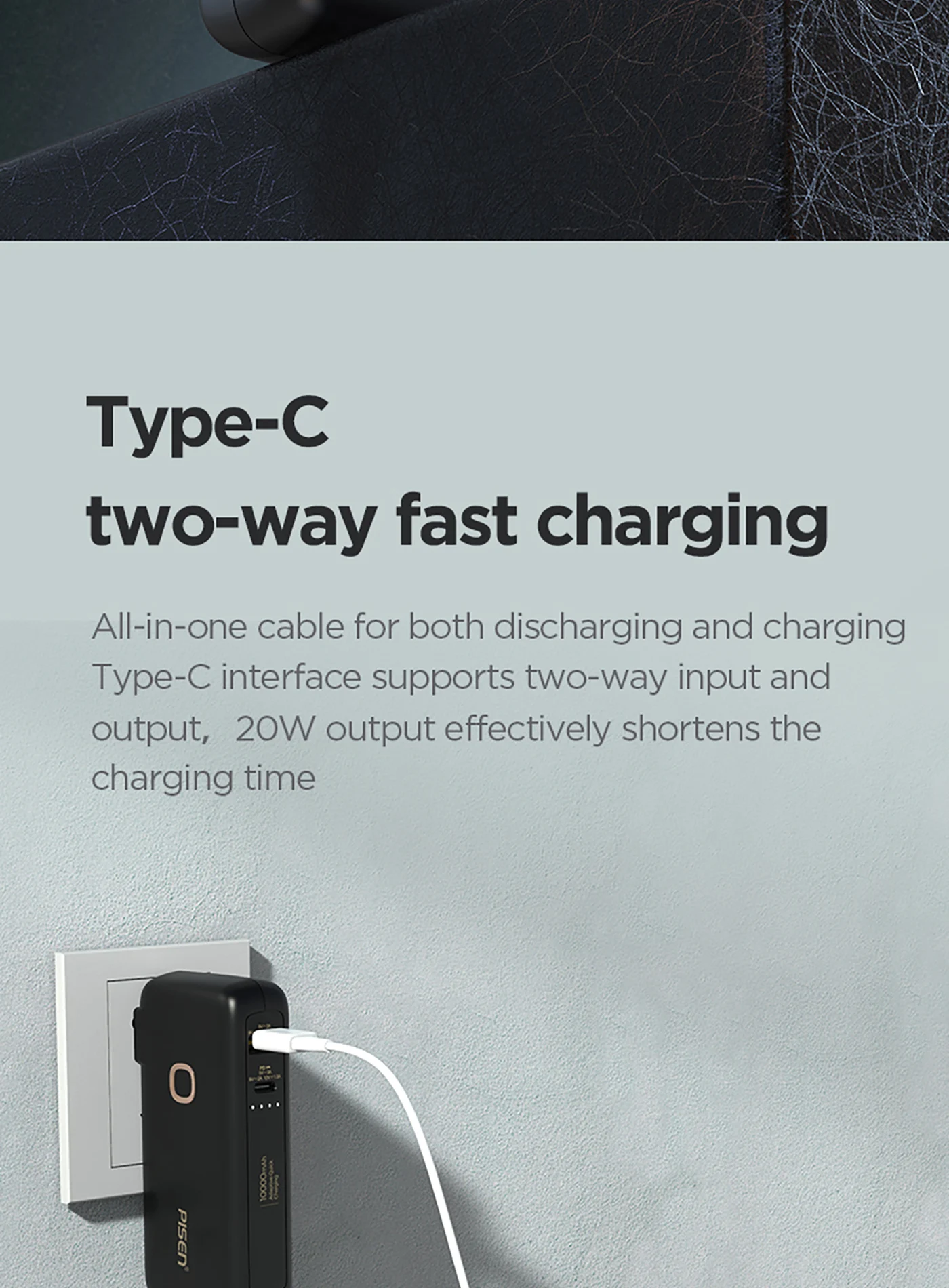 • Type-C two-way fast charging supports both input and output, with 20W output to shorten charging time