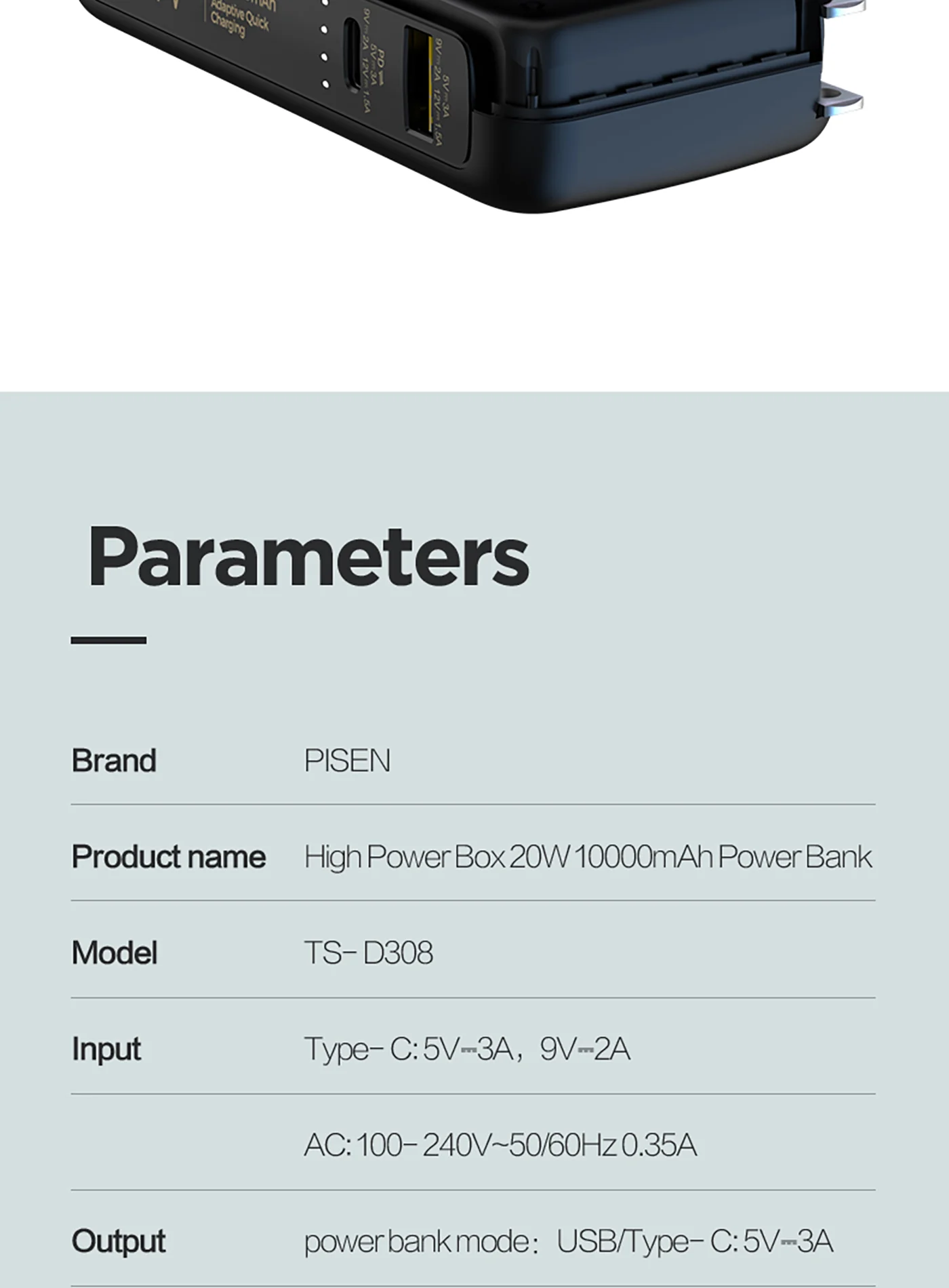 PISEN High Power Box 20W 10000mAh Power Bank TS-D308