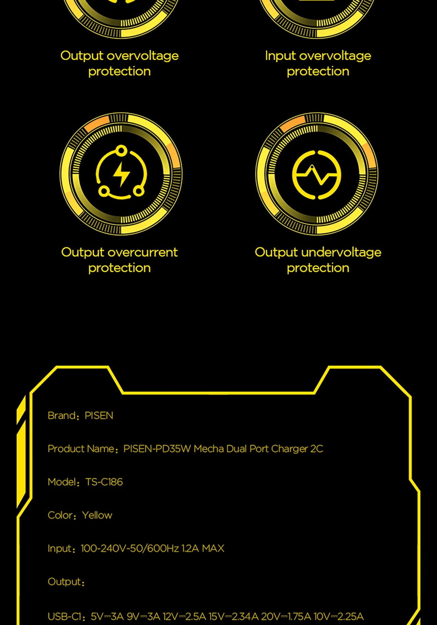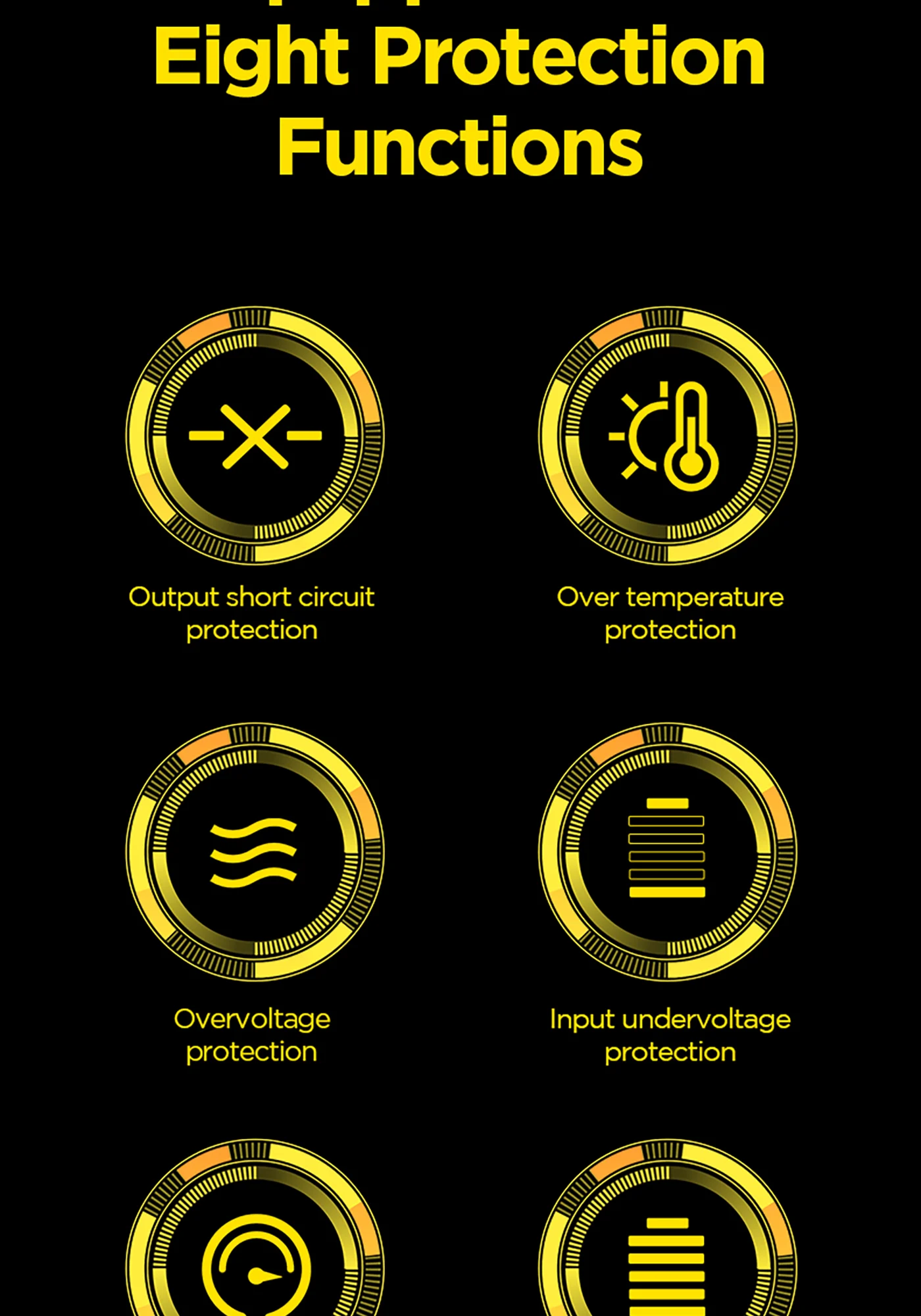 Protects against overcharge, overheat, short circuit, overvoltage.