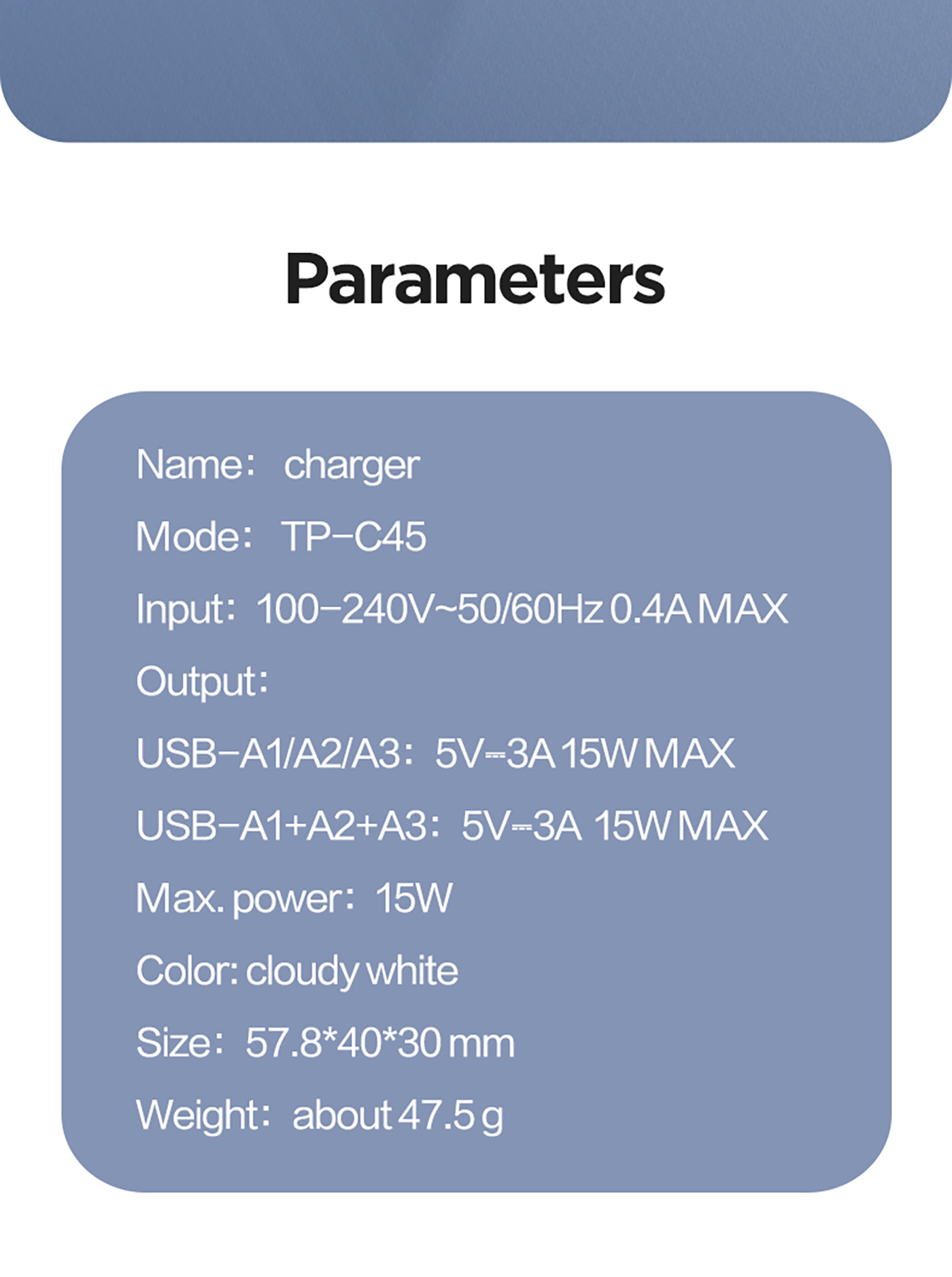 Be the first to review “PISEN Mr White Charger 3 USB-A 15W Charger(US) TP-C45” Cancel reply