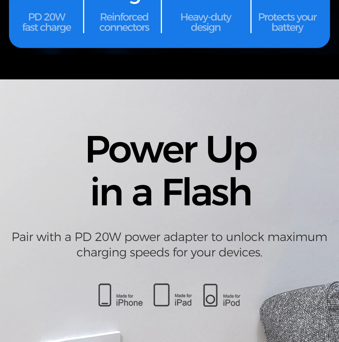 Delivers stable power for iPhone, iPad and other Lightning devices.