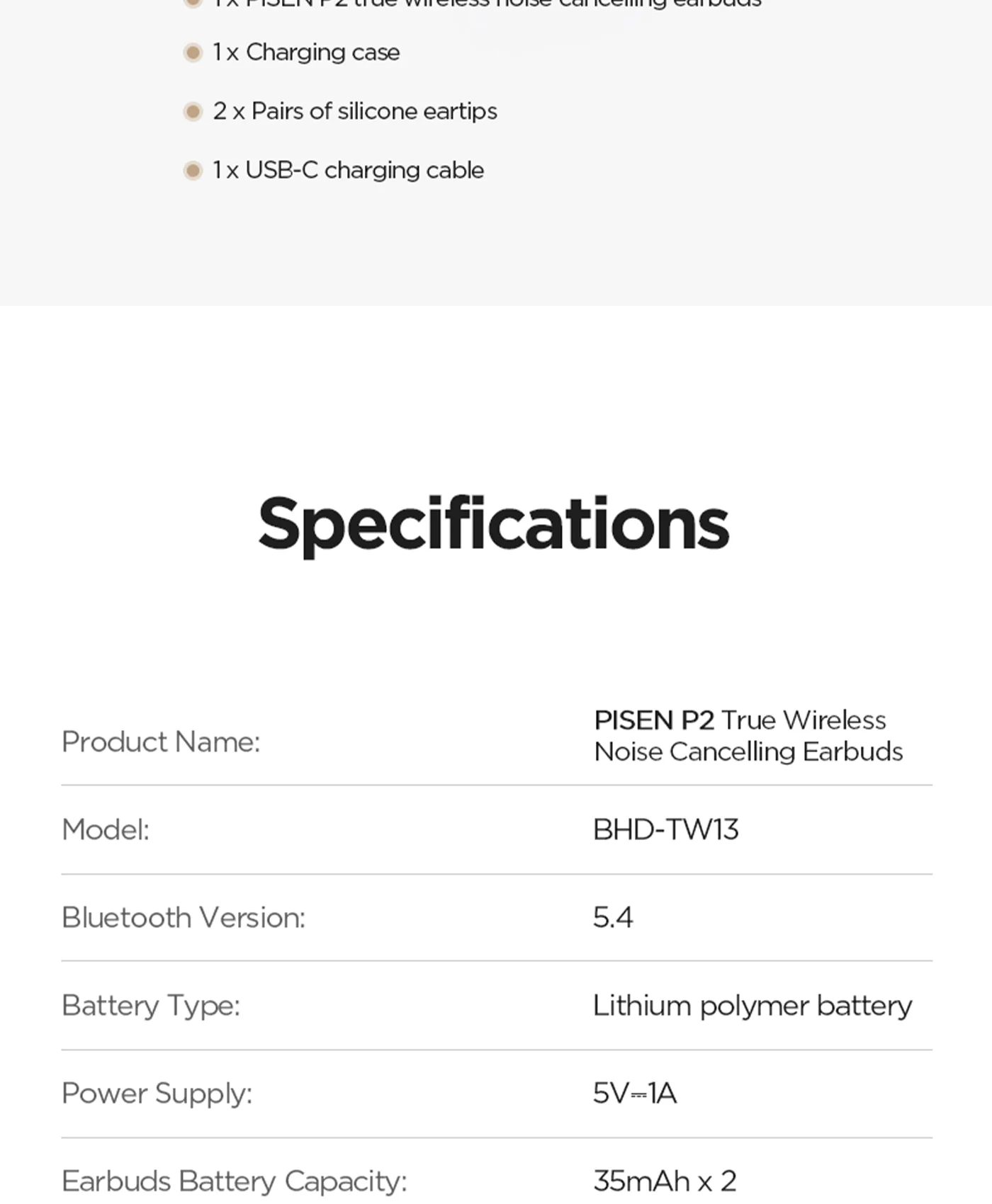 PISEN P2 Noise Cancelling True Wireless Bluetooth Earphones BHD-TW13