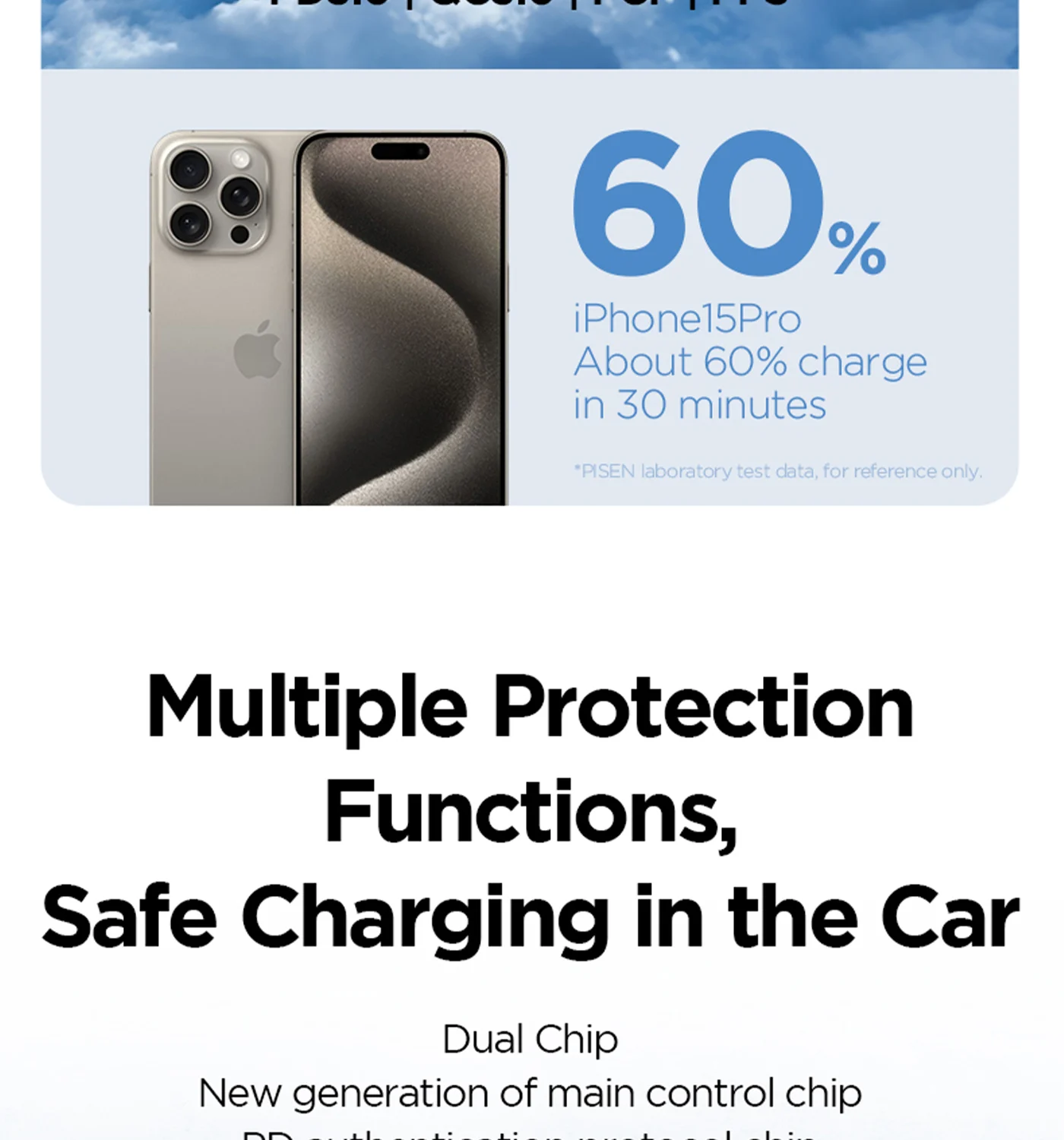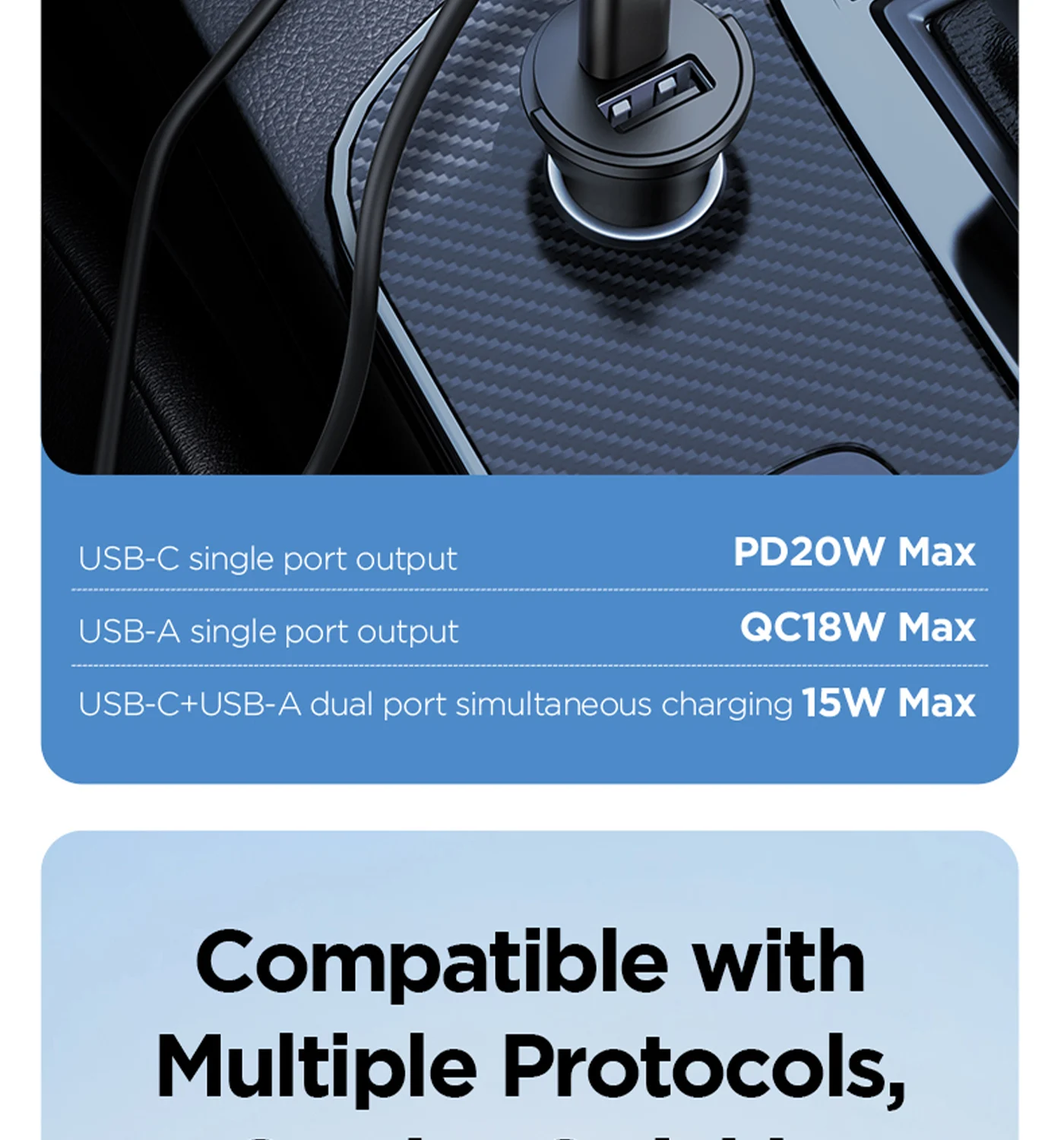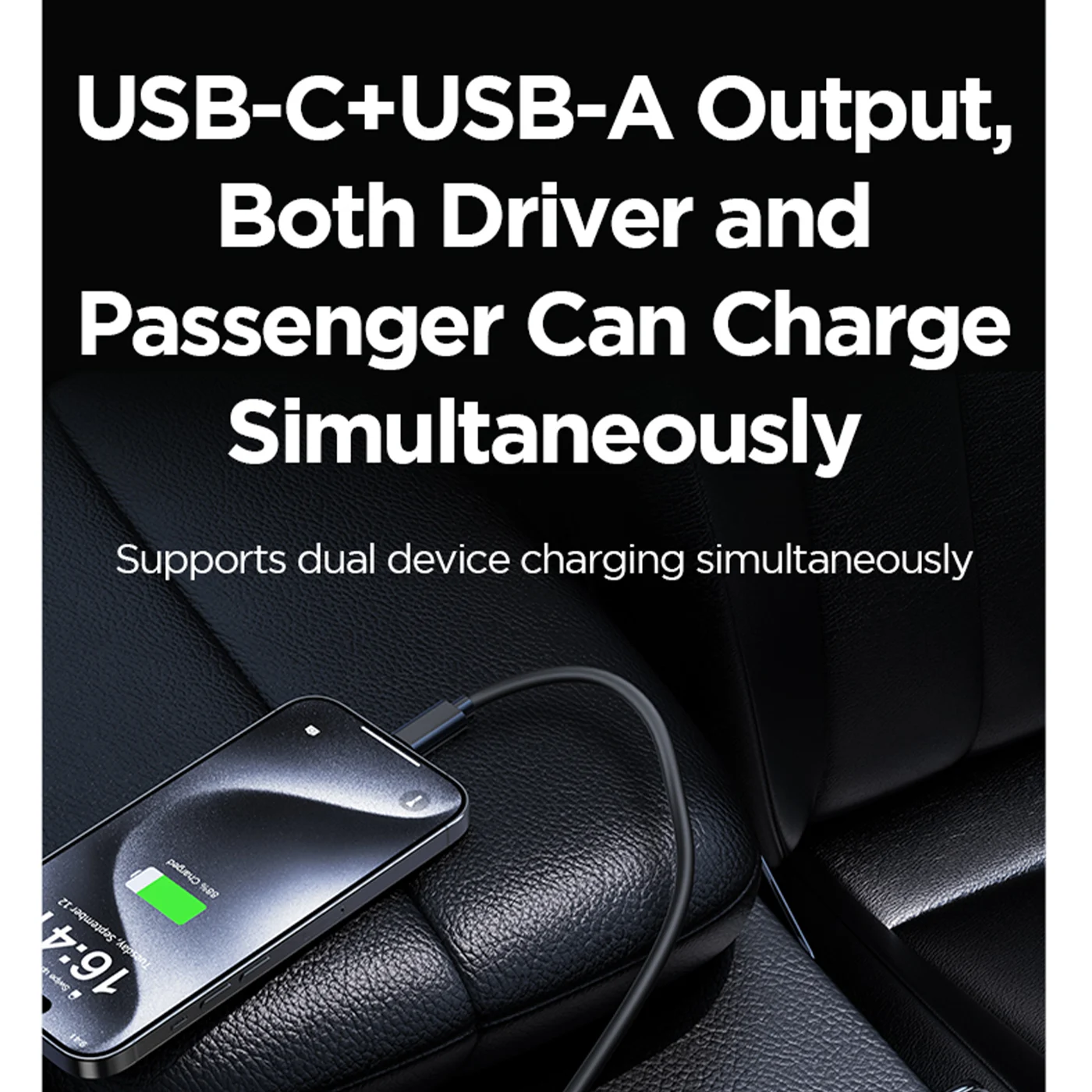 USB-C + USB-A ports for simultaneous charging of two devices.