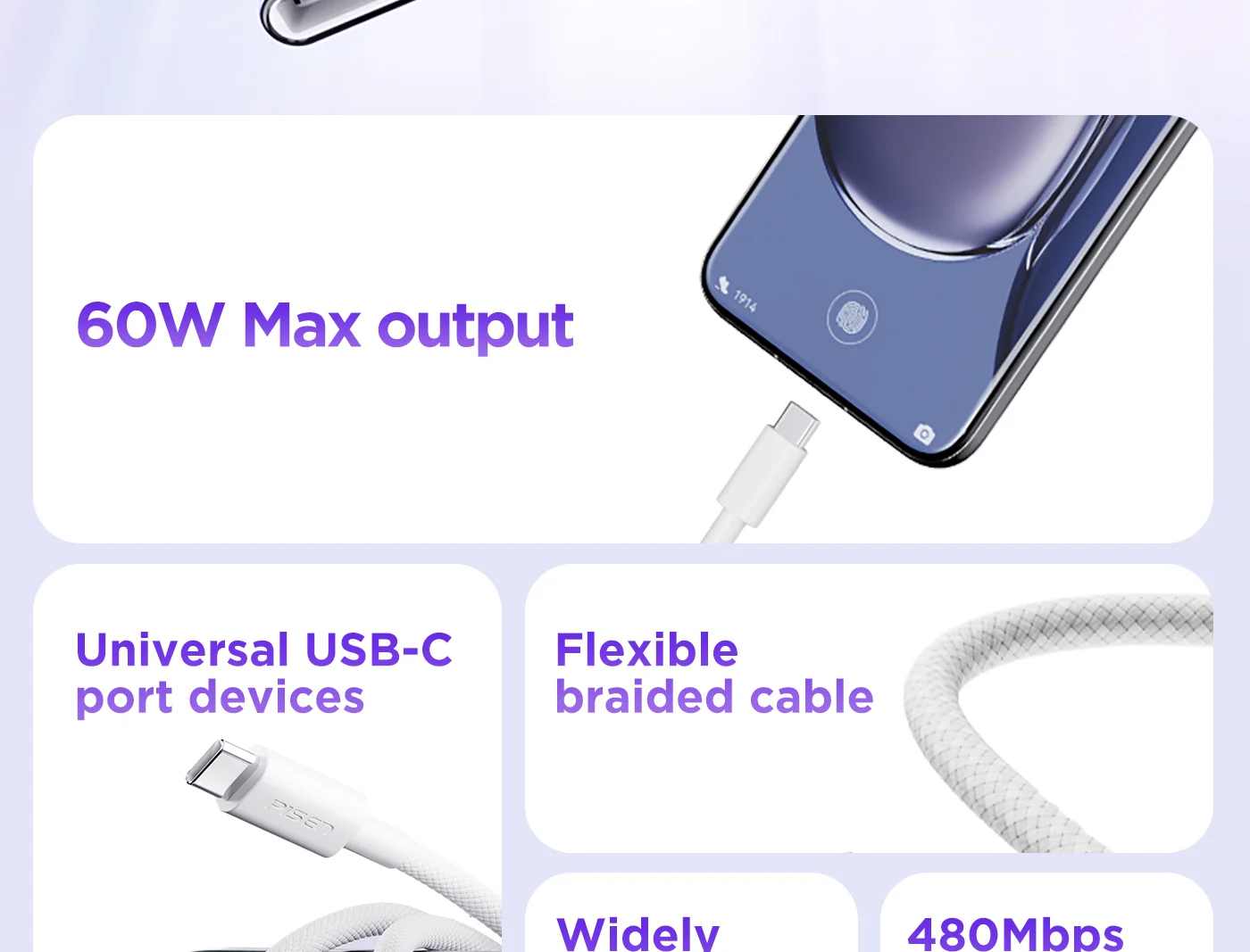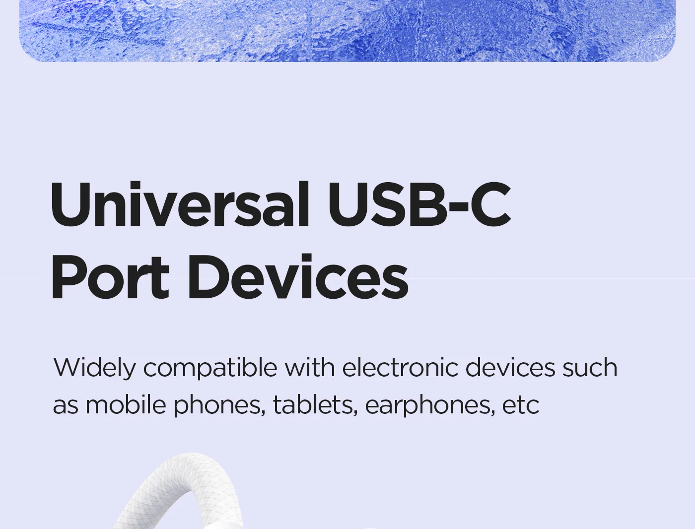 Supports high-speed charging when paired with a compatible adapter, delivering rapid power to your USB-C phones, tablets, and laptops. It also enables smooth USB 2.0 data transfer at up to 480Mbps, letting you sync photos, videos, and files in seconds.
