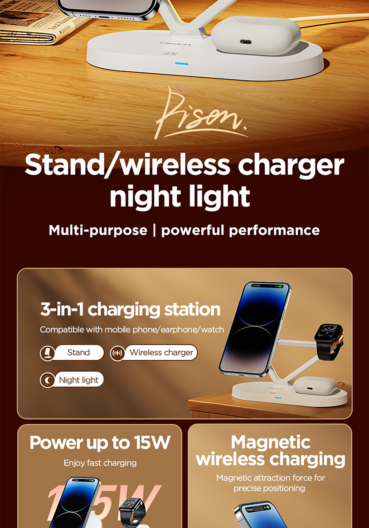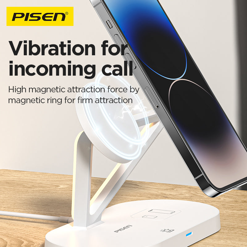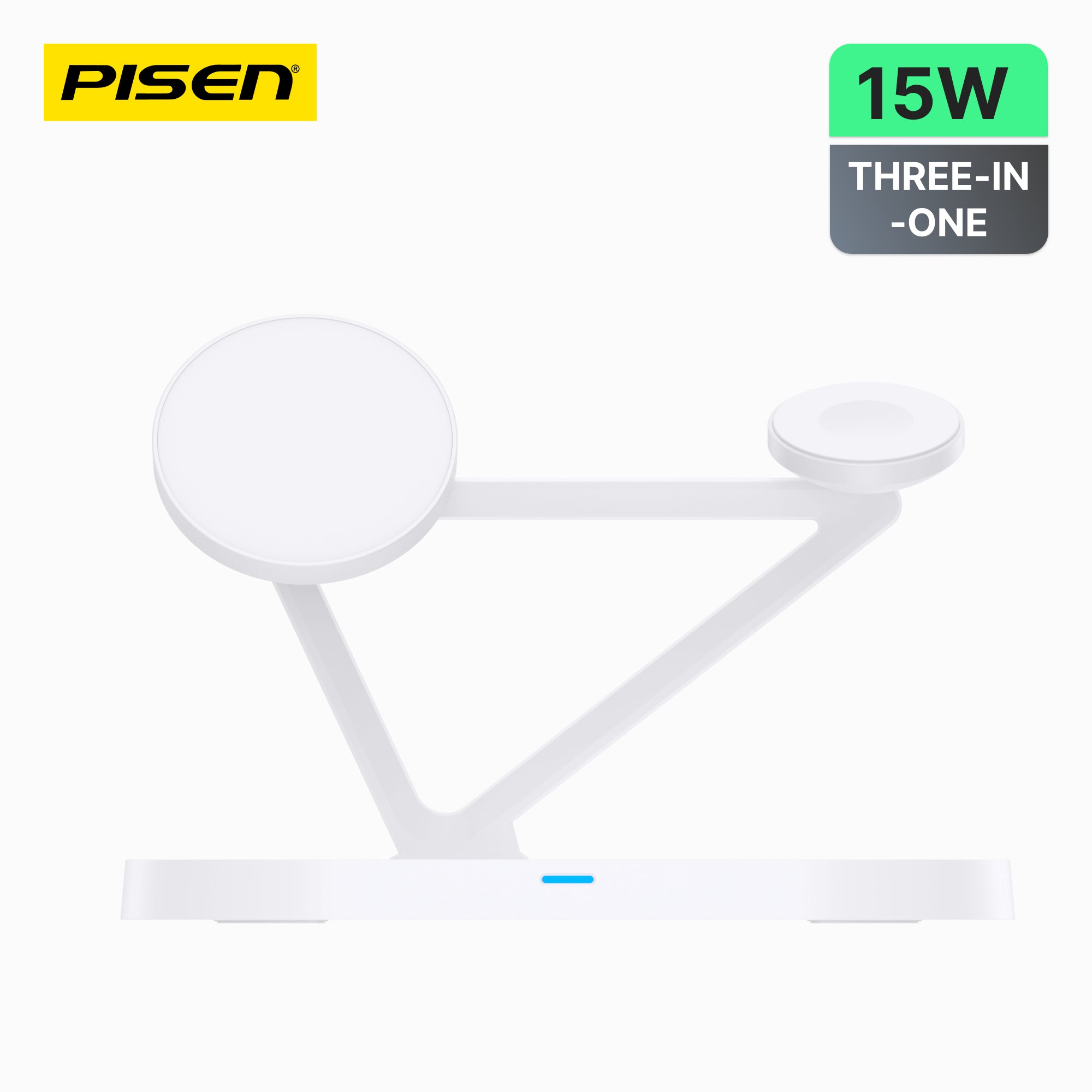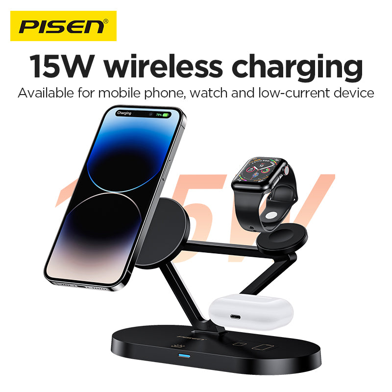 The PISEN 3-in-1 Charging Station offers an all-in-one solution for your charging needs, blending functionality with convenience and style: