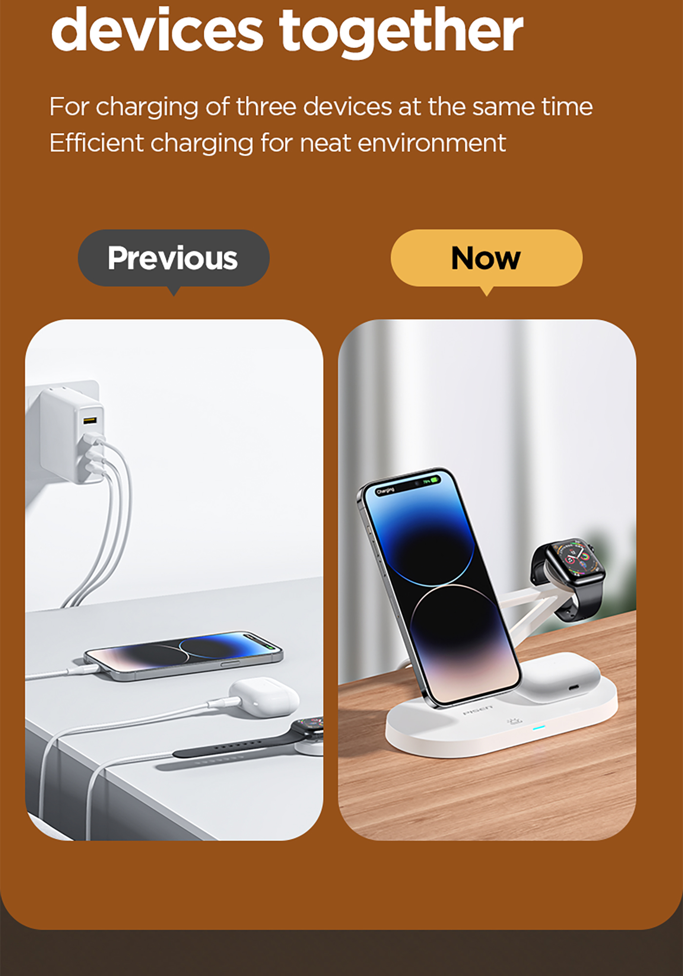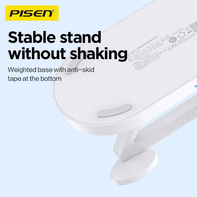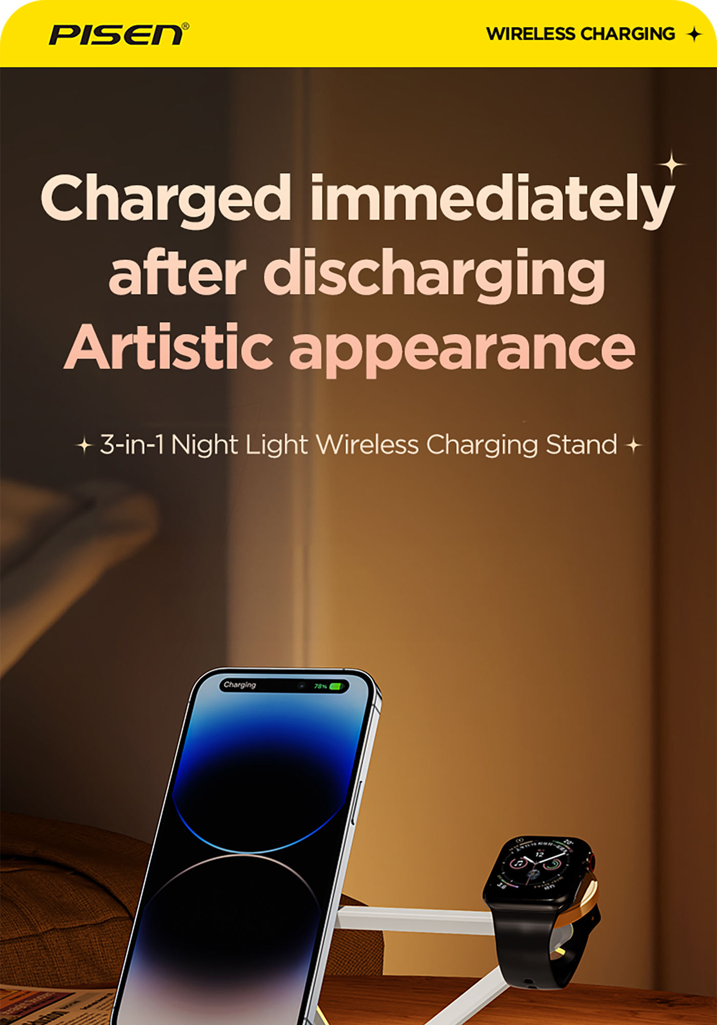 The PISEN 3-in-1 Charging Station offers an all-in-one solution for your charging needs, blending functionality with convenience and style: