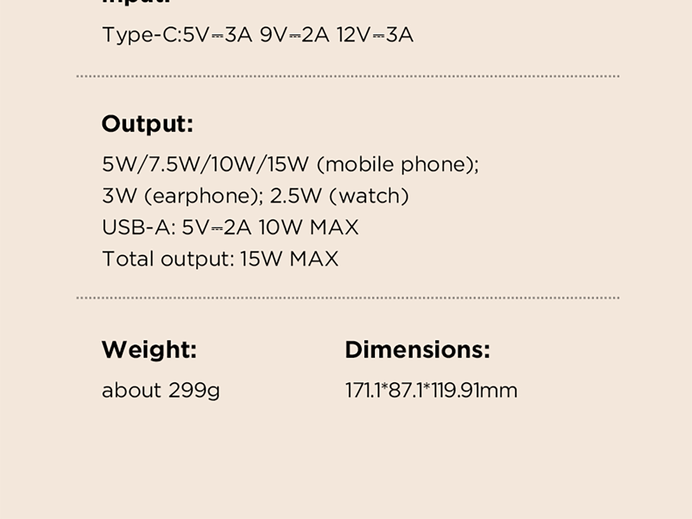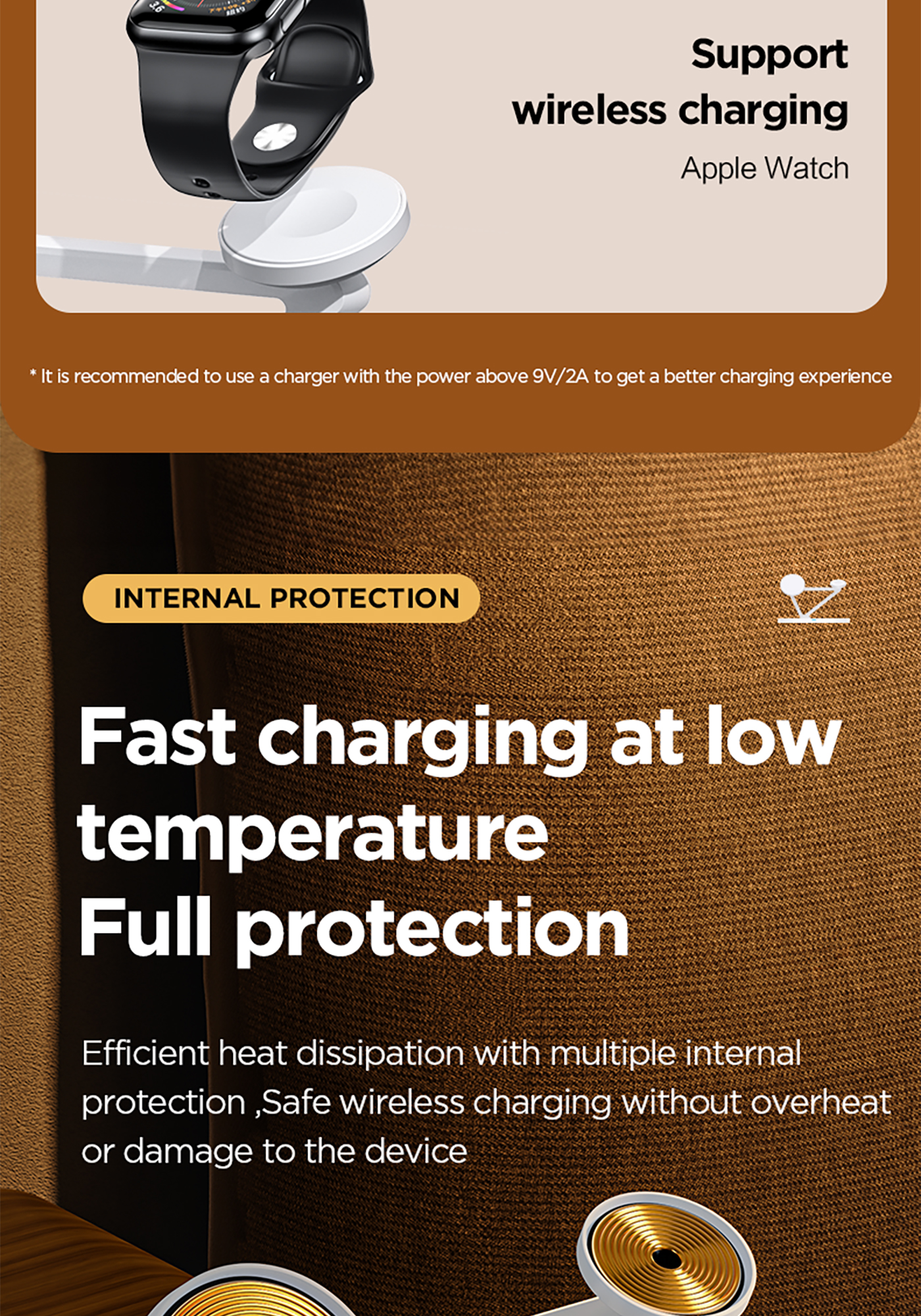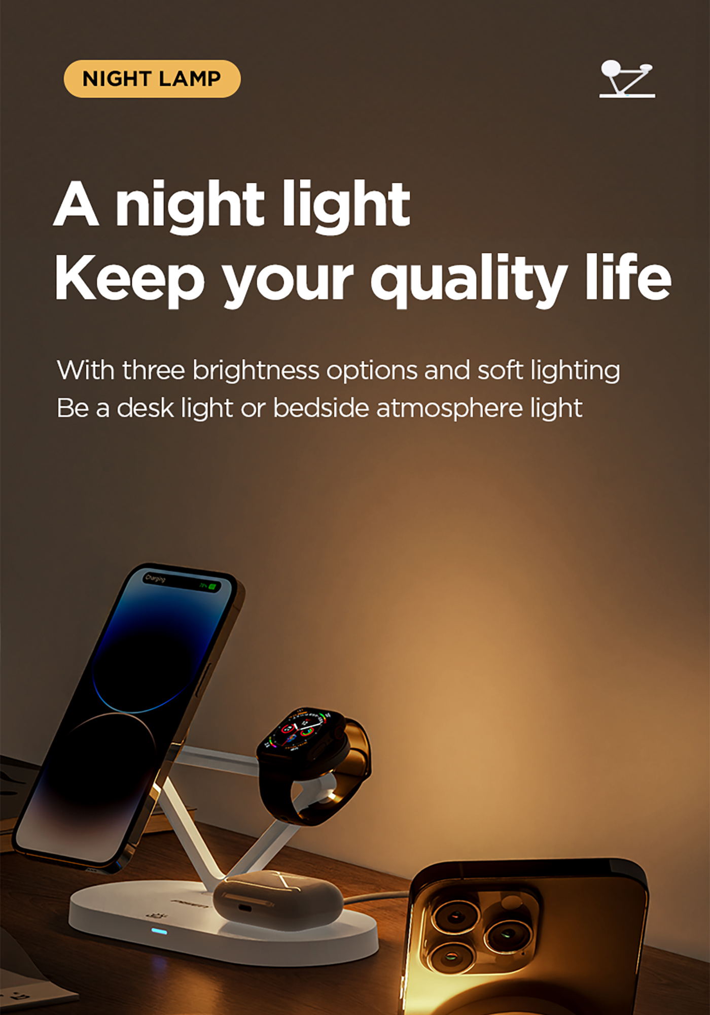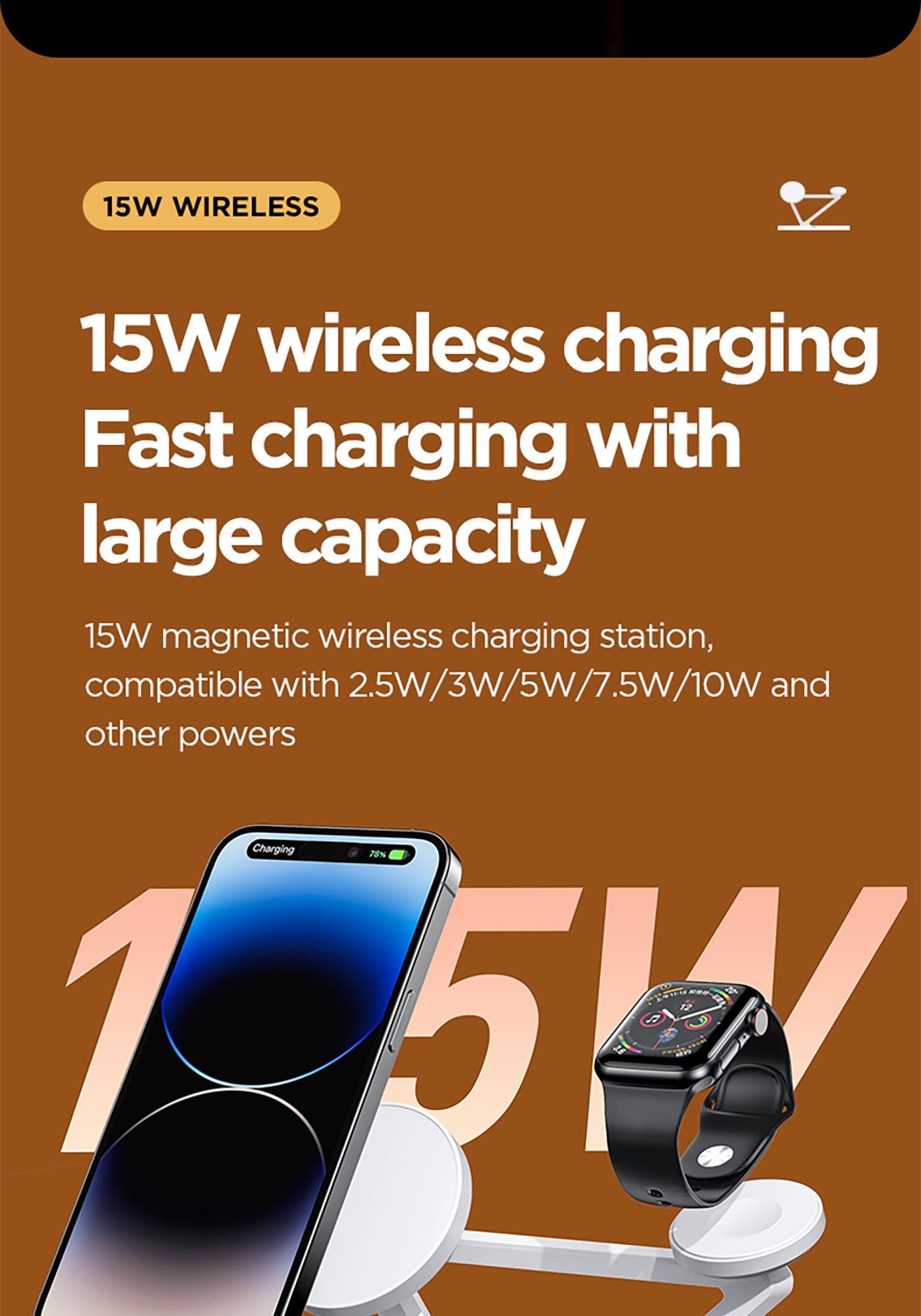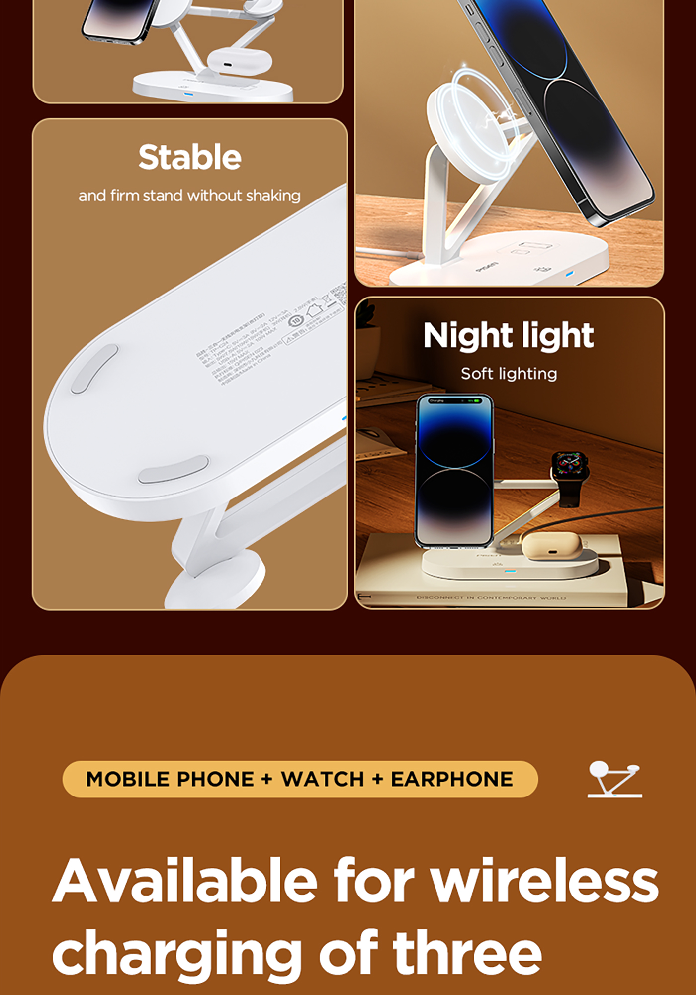 - 3-in-1 charging station: compatible with mobile phones, earphones, and smart watches, providing a single hub for all your devices.