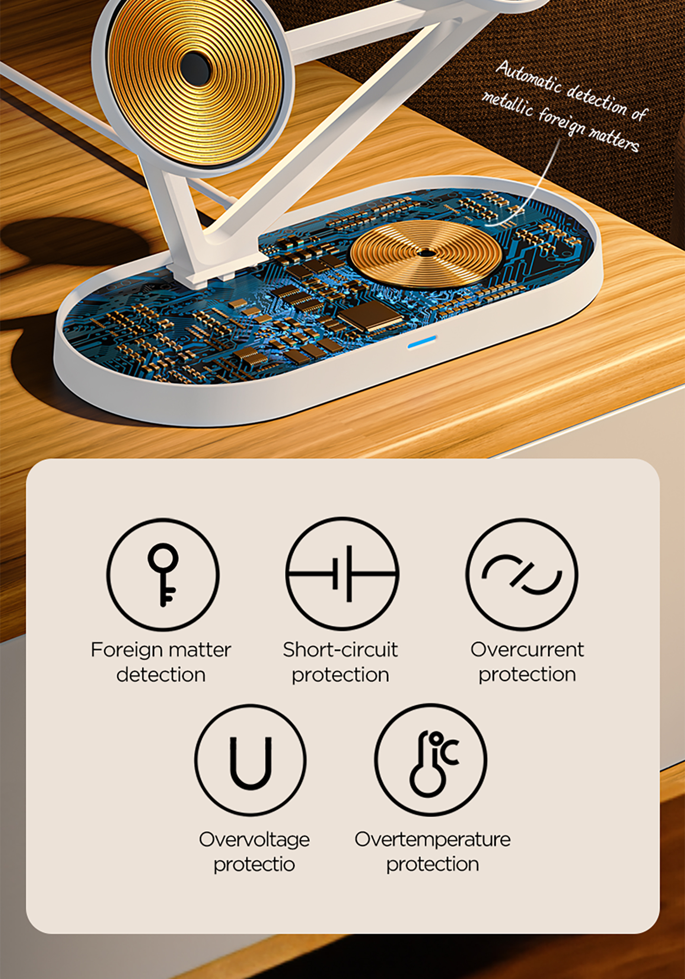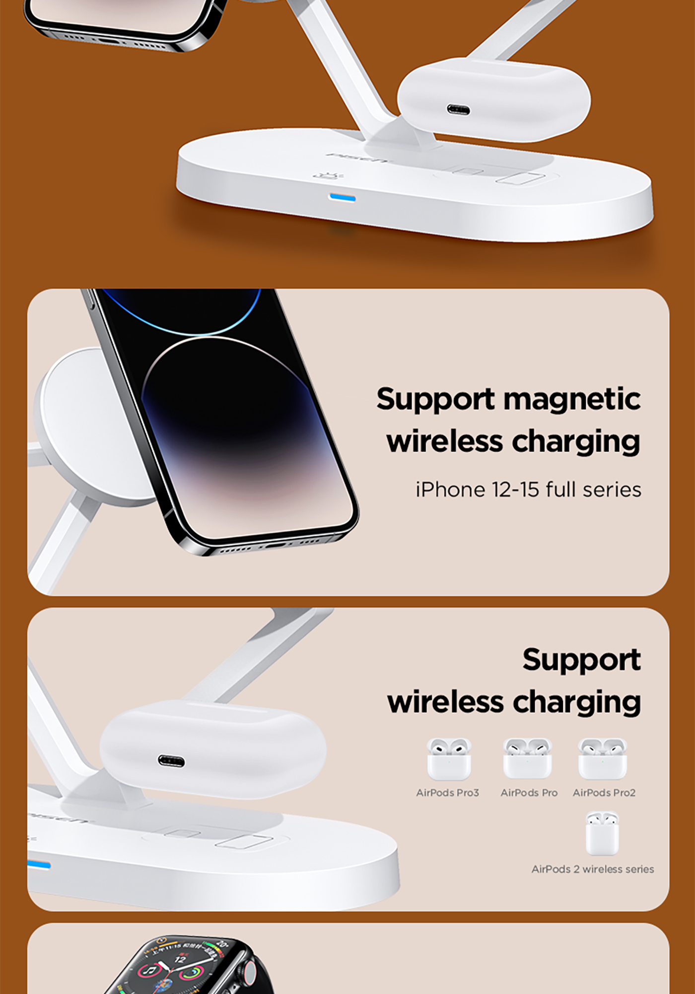- Magnetic wireless charging: ensures precise positioning with strong magnetic attraction, keeping your devices securely in place.